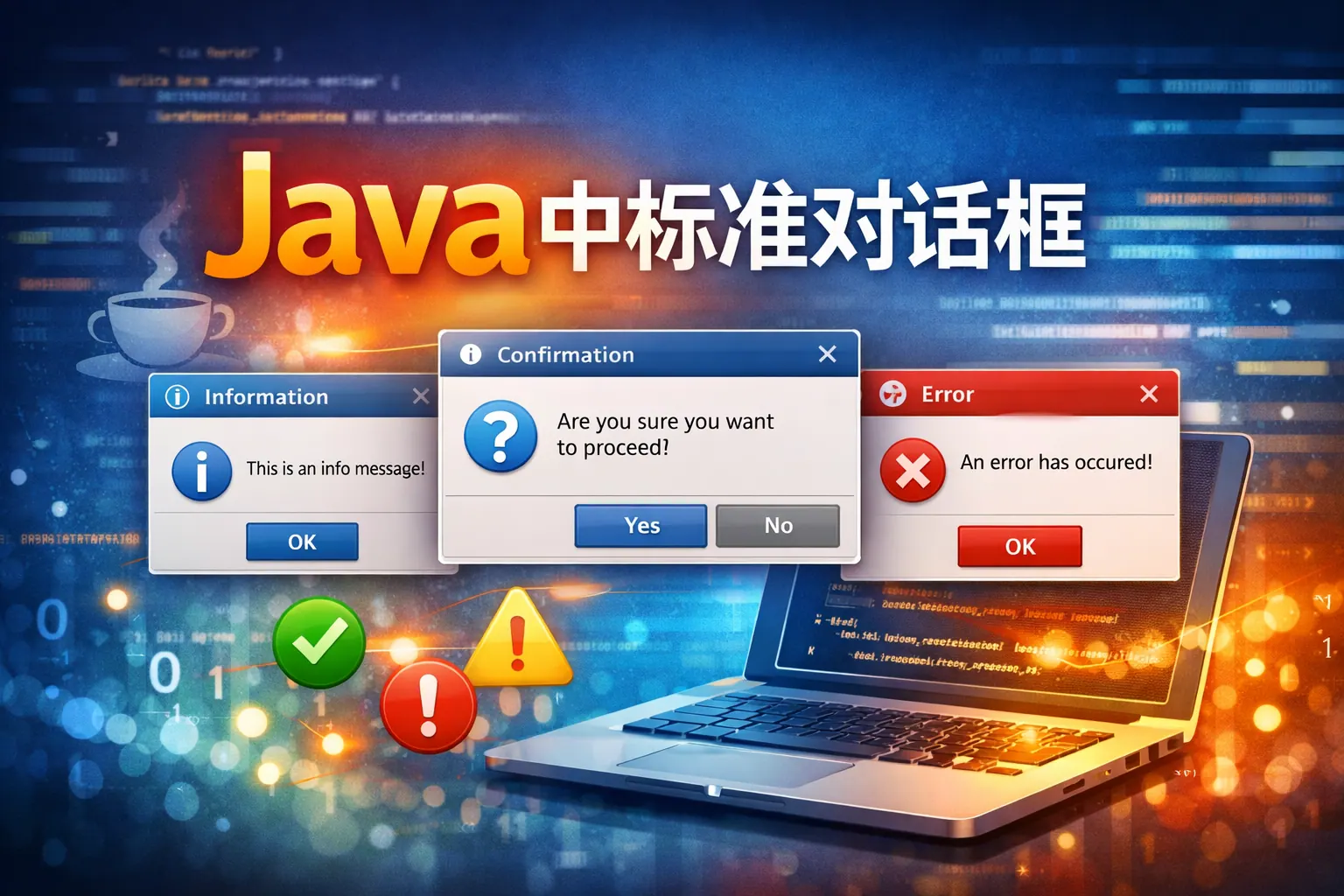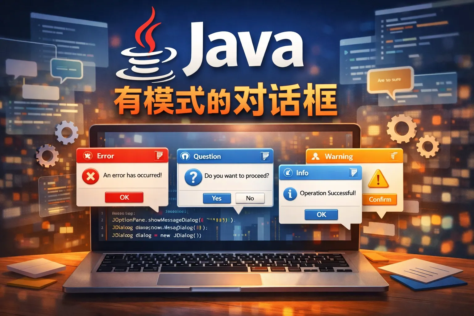 Java中的标准对话框主要包括消息对话框、确认对话框、输入对话框以及基于JDialog的自定义对话框,通常通过Swing的JOptionPane类实现。这些对话框适用于信息提示、用户确认、数据输入等常见交互场景,不同类型在返回值、图标样式和使用方式上存在差异。合理选择和规范使用标准对话框,有助于提升桌面应用的用户体验与系统一致性。随着技术发展,虽然JavaFX逐步普及,但Swing标准对话框在企业级应用中仍具有重要地位。