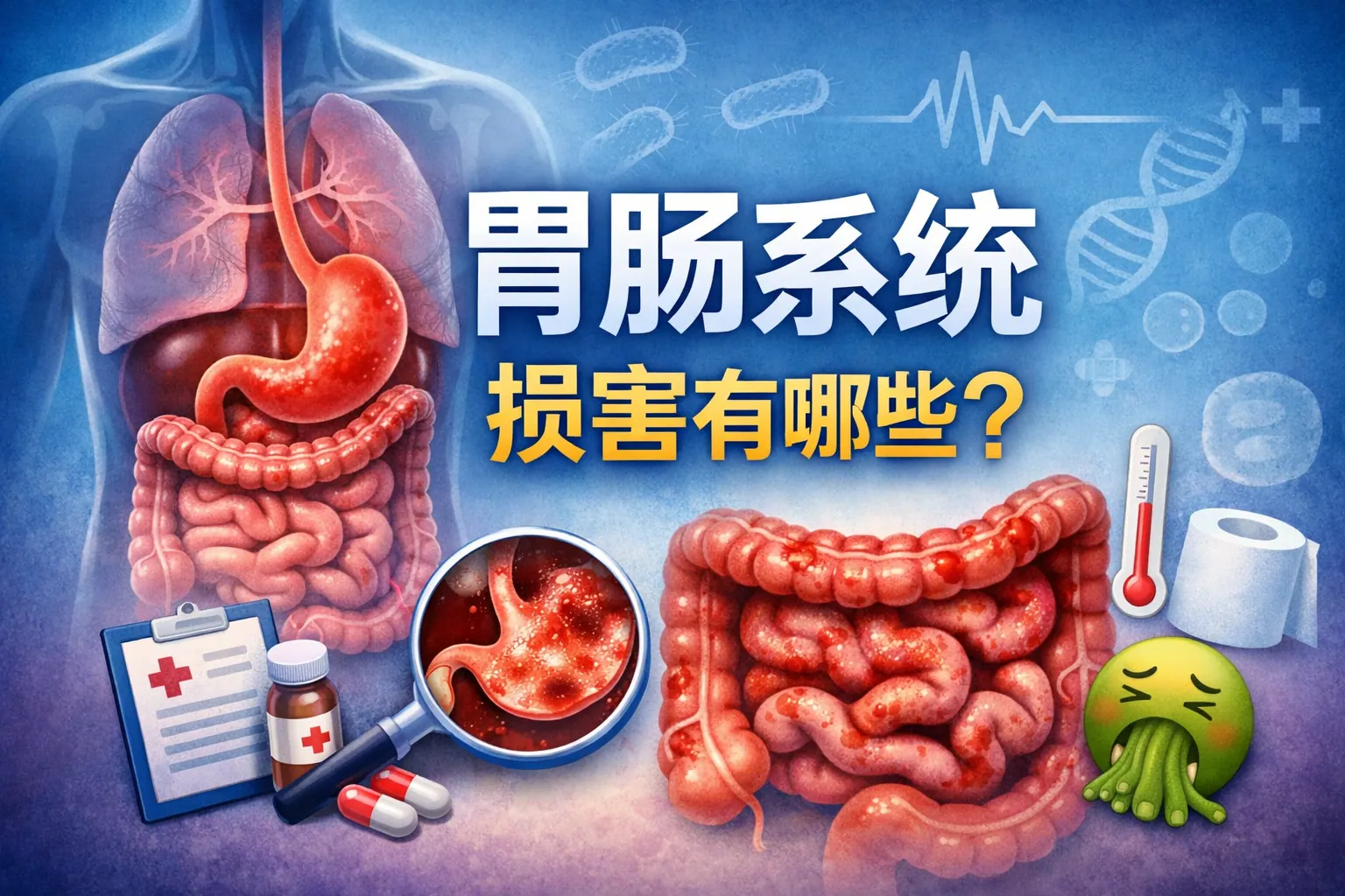 胃肠系统损害包括感染性、炎症性、功能性、药物相关、溃疡性以及肿瘤性等多种类型,常见表现为腹痛、腹泻、便血、消瘦和消化不良等症状。不同类型在病因和严重程度上存在明显差异,但早期识别与规范管理是降低并发症风险的关键。通过健康生活方式、定期筛查和科学治疗,可有效减少胃肠疾病负担。未来随着精准医学发展,胃肠系统疾病的诊疗将更加个体化和系统化。