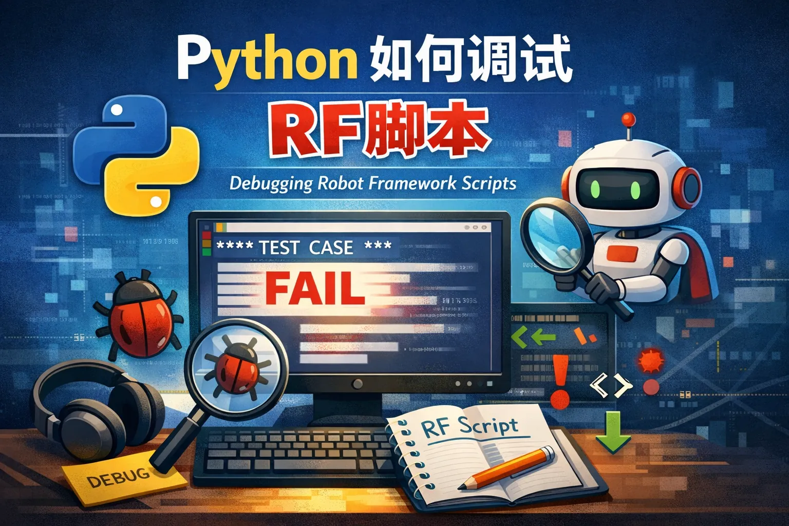 要在Python环境下高效调试Robot Framework脚本,先用高等级日志与内置关键字快速缩小问题范围,再选择断点路径:在Python关键字库中用pdb或debugpy(IDE附加)进行单步与变量检查,在.robot文件中借助VS Code调试适配器或DebugLibrary实现用例级断点;同时用Listener采集事件与时序信息,构建可观察性,最后将日志与证据接入协作平台形成复现实验与缺陷闭环,从而兼顾效率与精度