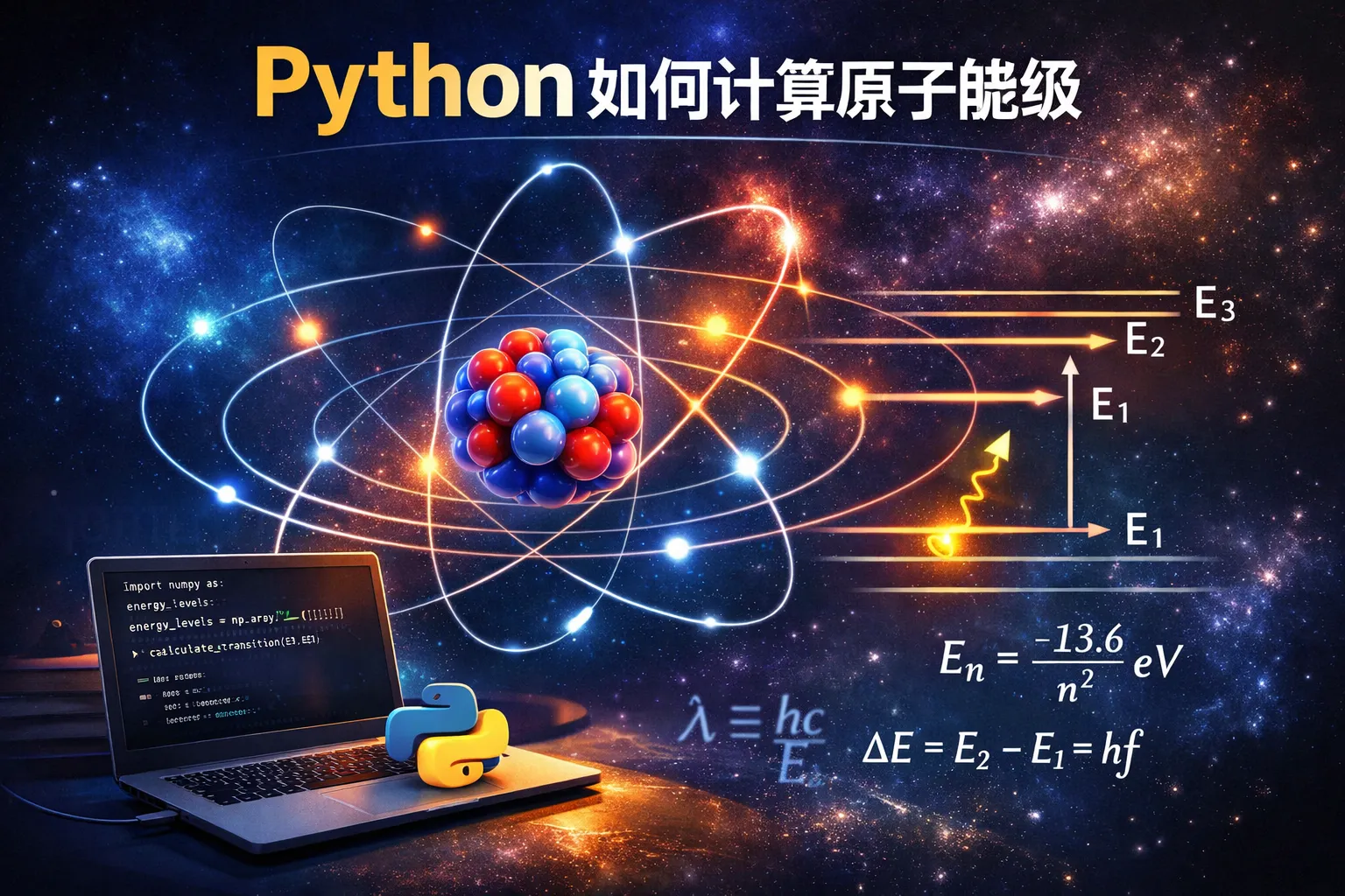 本文给出用Python计算原子能级的可执行路径:单电子体系用解析解与径向有限差分求本征值,多电子原子用PySCF进行HF/DFT并以TDDFT或CI获取激发能;全程采用CODATA常数,数值上以稀疏本征求解与收敛测试保证稳定,并用NIST数据校验能级与谱线;结合可视化与模块化设计,形成从教学到研究的可复现实践流程。===