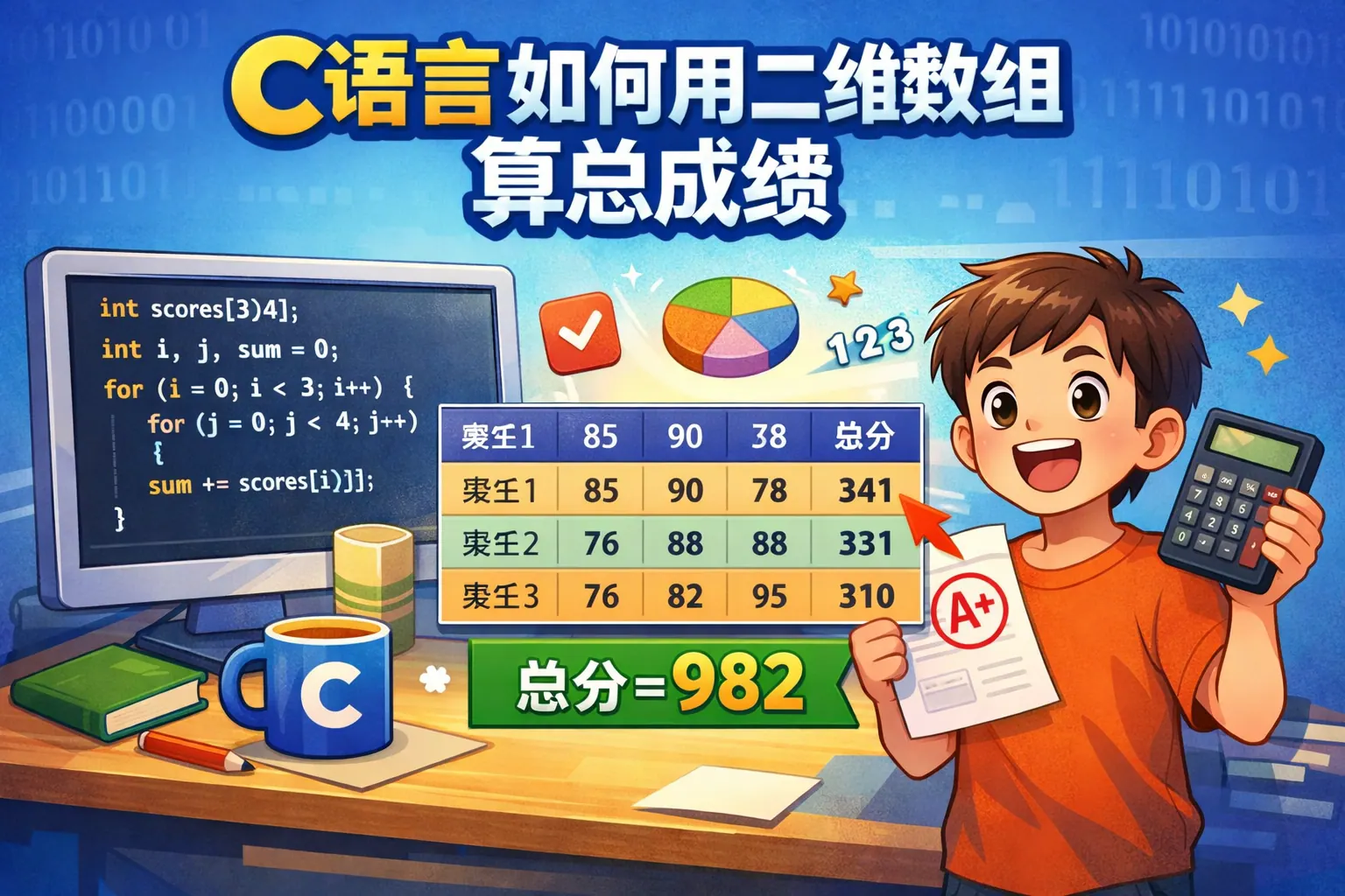 c语言如何用二维数组算总成绩