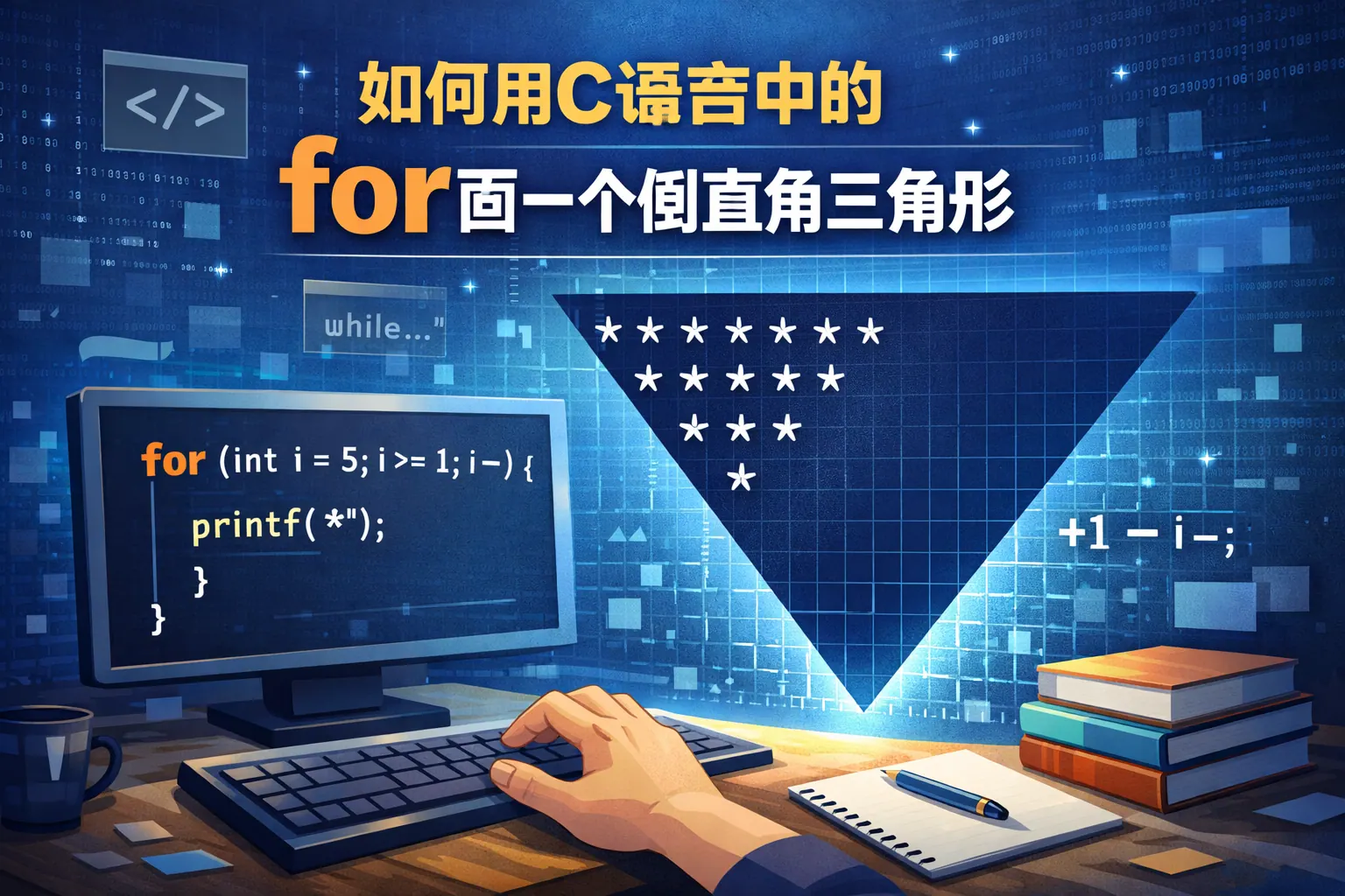 本文系统讲解了如何使用C语言中的for循环绘制倒直角三角形,重点解析了左对齐与右对齐两种实现方式,以及循环变量之间的数学关系。通过代码示例、逻辑推导和常见错误分析,帮助读者理解行数与列数递减规律。文章还延伸到算法思维训练,强调循环结构在编程学习中的基础地位。