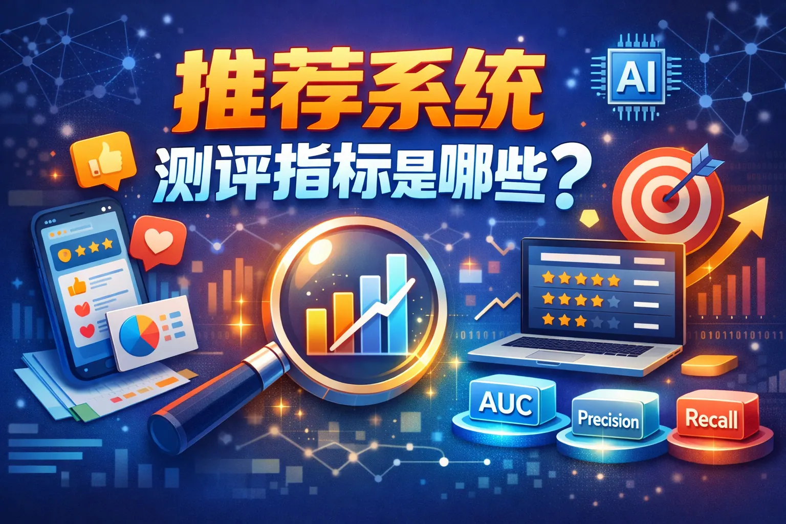 推荐系统测评指标主要包括准确性指标(Precision、Recall、AUC等)、排序指标(NDCG、MAP、MRR)、多样性与覆盖指标,以及在线业务指标(CTR、转化率、留存率等)。离线指标用于模型优化与对比,在线指标用于验证真实商业价值。不同推荐场景应选择匹配的评估体系,并结合A/B测试进行统计验证。未来推荐系统评估将更加关注长期用户价值、多样性与公平性等多维指标,而非单一准确率。