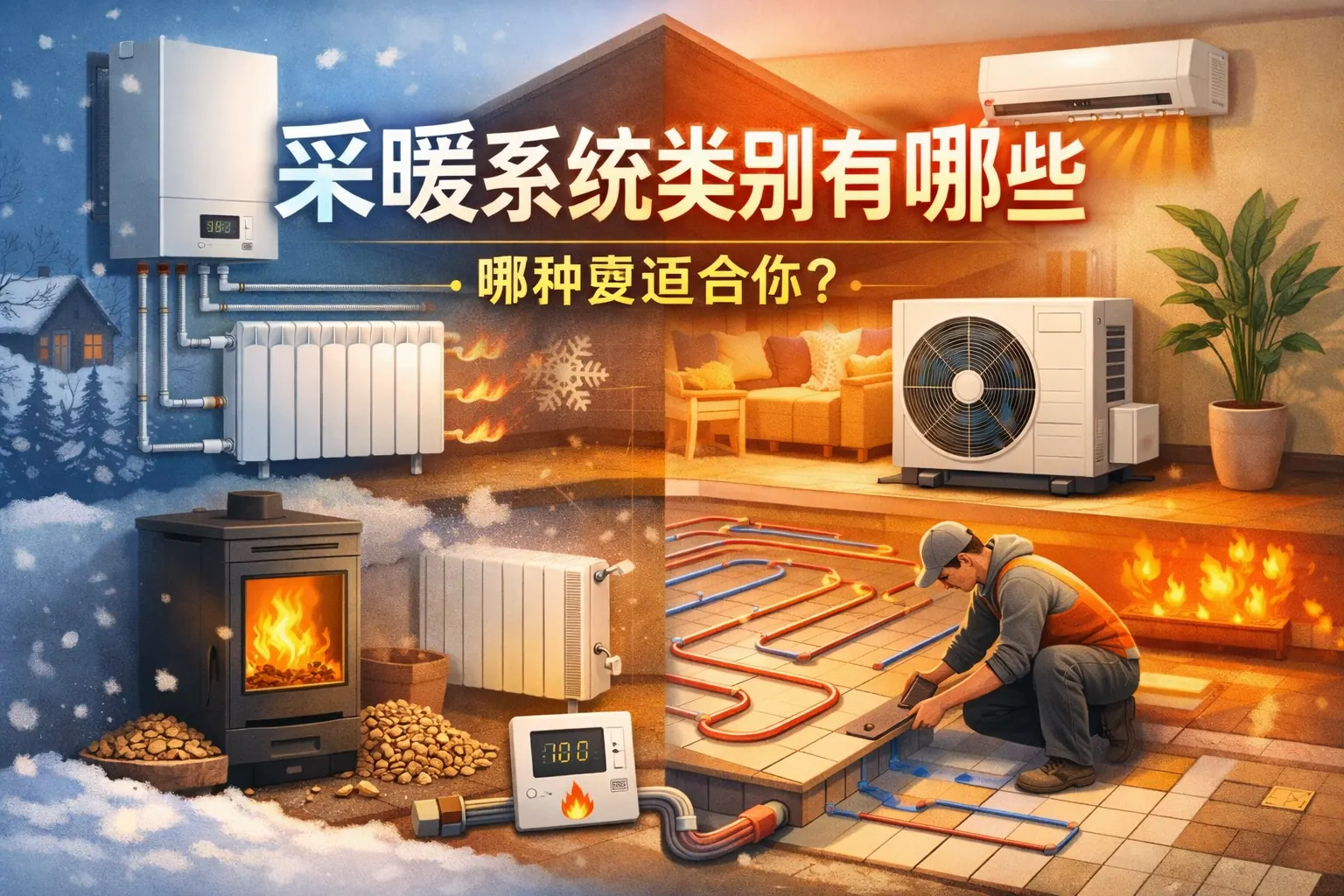 采暖系统主要包括集中供暖、分户独立采暖、电采暖、燃气采暖、热泵采暖以及可再生能源采暖等类型。不同系统在能源结构、初投资、运行成本、舒适度和适用场景方面差异明显。集中供暖适合高密度城市区域,分户和燃气系统强调自主控制,电采暖安装灵活,热泵系统具备较高能效和低碳优势。未来采暖系统将朝着低碳化、电气化与智能化方向发展,选择时应结合建筑类型、气候条件与能源价格综合评估。