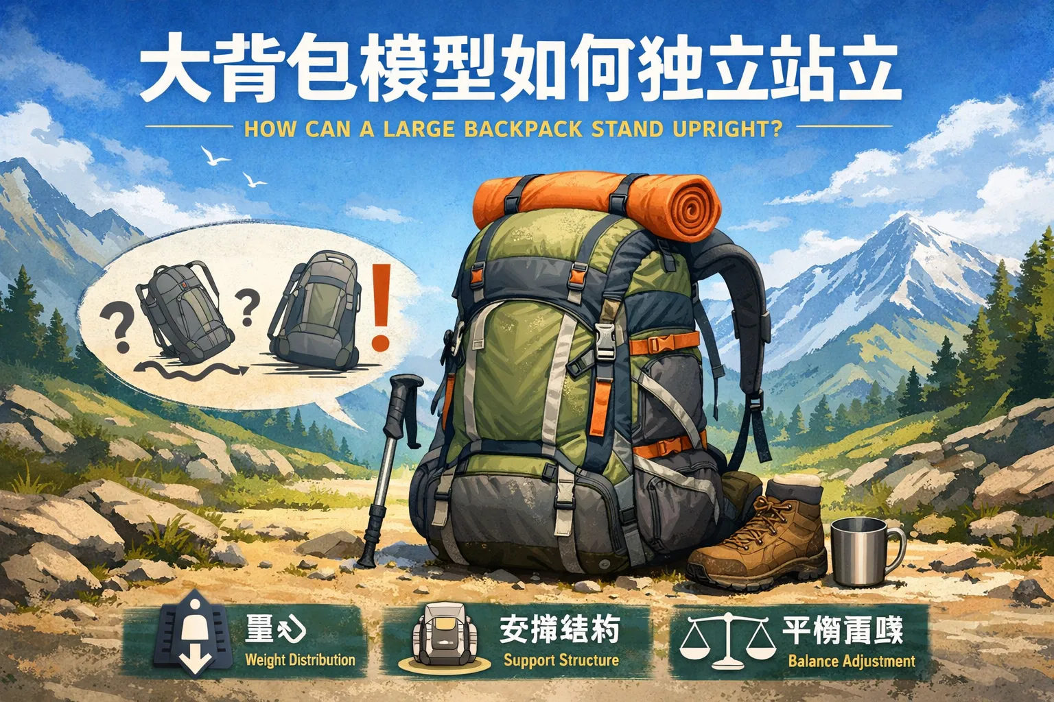 让大背包独立站立的核心在于重心位置、支撑面形状与刚度三要素协同:通过背板/骨架提升硬度、硬底座与脚垫扩大接地与摩擦、重物靠背中上部且左右对称装载;再辅以压缩收纳与三点接触底部几何,既能提升抗侧倾与抗滑移,也能提高扰动后的自恢复能力。按“形状>刚度>摩擦”的优先级逐步优化,多数背包均可稳定自立。