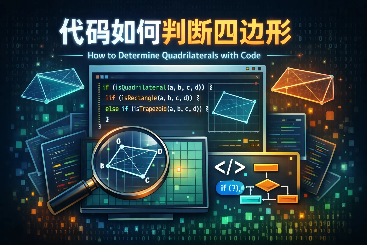 判断四边形是否合法,核心在于通过代码验证四个点是否构成不共线、无自交、首尾闭合的多边形结构,并进一步利用向量叉积、线段相交检测、边长与角度关系判断其类型,如凸四边形、矩形或正方形。实现过程中需注意浮点精度误差问题,工程实践中还需结合图形渲染或视觉识别场景进行扩展优化。随着计算机视觉与图形算法发展,四边形判定已从基础几何运算演进为智能图形识别的重要能力。