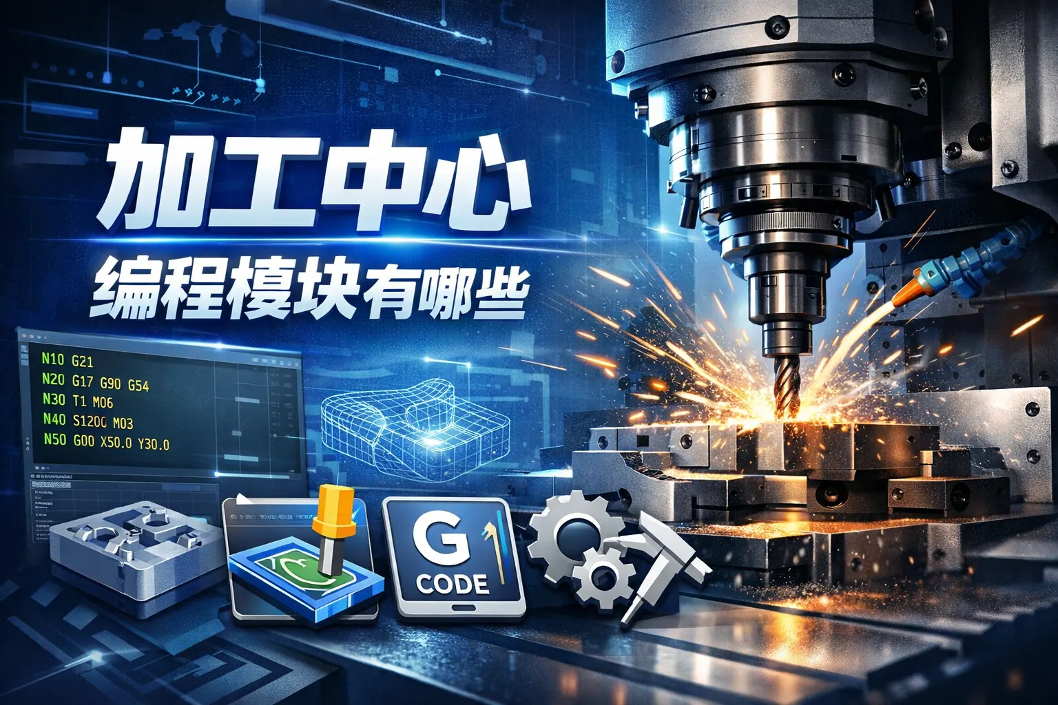 加工中心编程模块主要包括几何建模、工艺规划、刀具路径生成、后处理、仿真检测、参数与刀具管理、宏程序控制以及数据通信集成等内容。其中刀具路径与仿真模块对加工效率和质量影响最大,后处理与参数管理保障程序稳定运行。随着数字化制造发展,编程模块正向智能化、自适应优化和系统集成方向升级,形成从设计到加工的完整闭环体系。