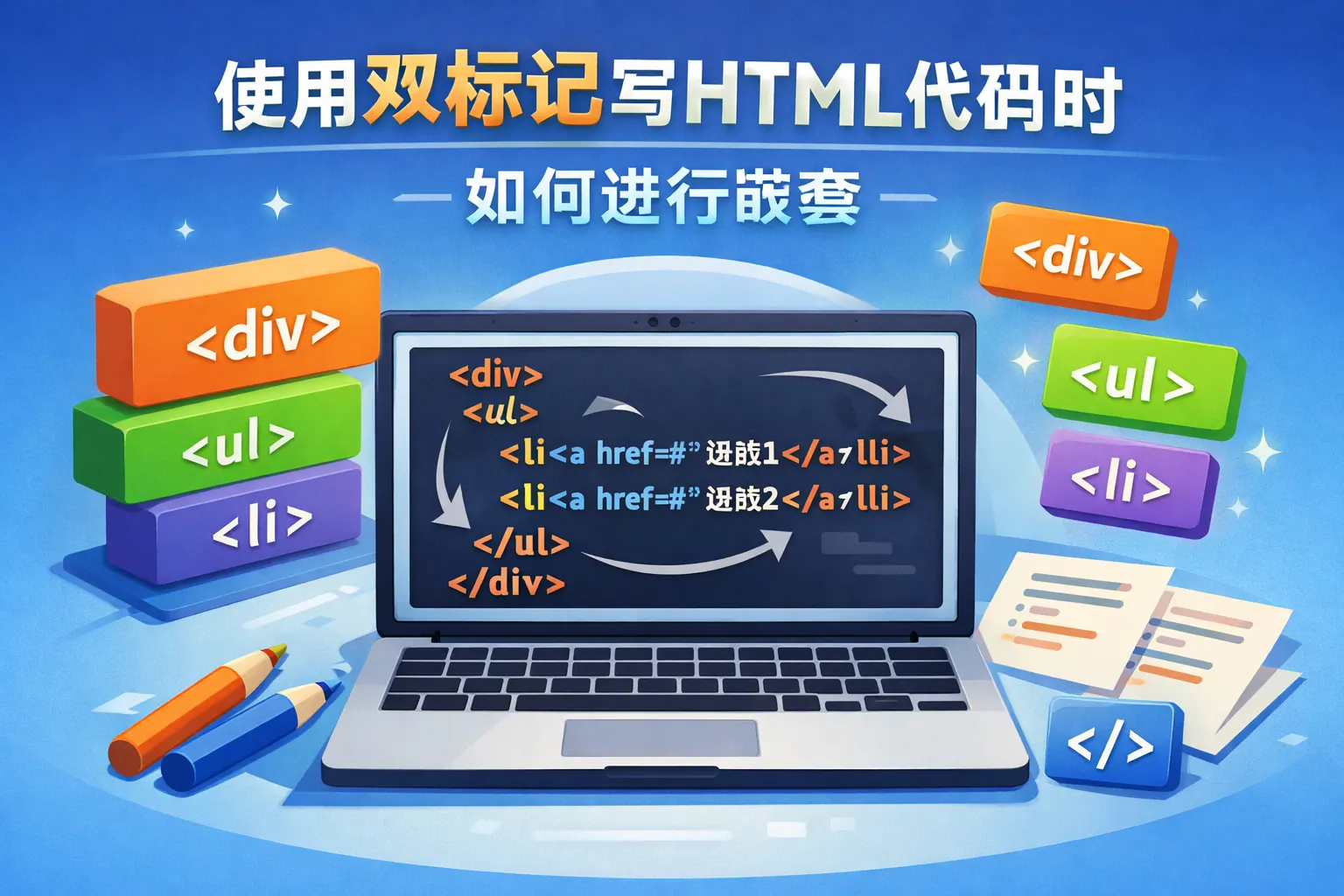 使用双标记写html代码时 如何进行嵌套