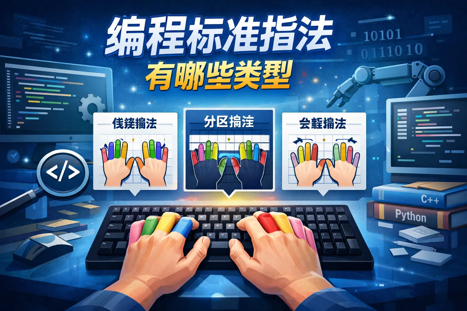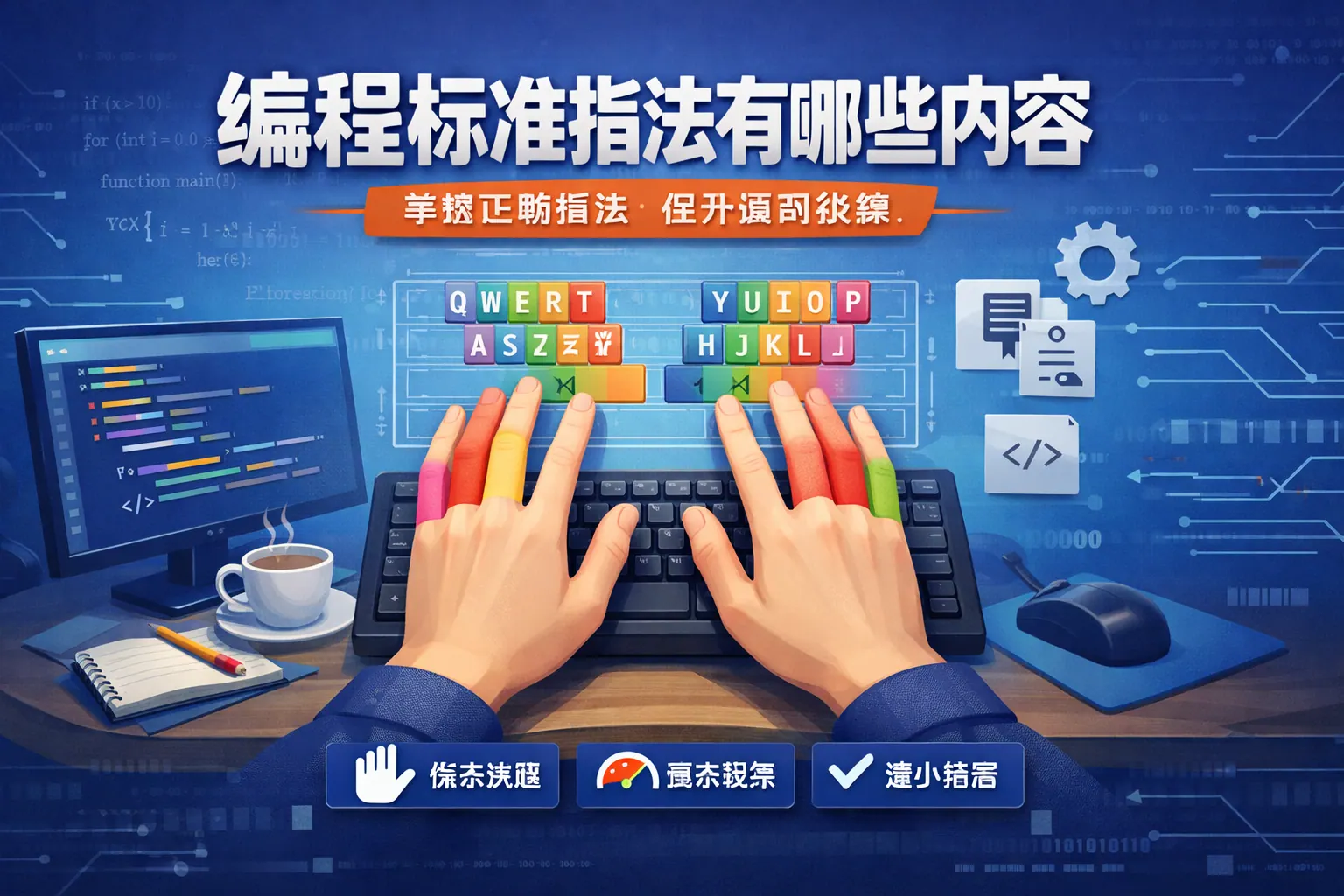 编程标准指法包括键盘手指分区、基准键位回位规则、符号与组合键操作方式以及人体工学姿势规范等内容。其核心目标是通过固定手指分工与科学击键路径建立肌肉记忆,从而提升代码输入效率、降低错误率并减少手腕疲劳。规范指法不仅影响打字速度,更直接关系到长期开发效率与职业健康,是程序员必须掌握的基础能力。