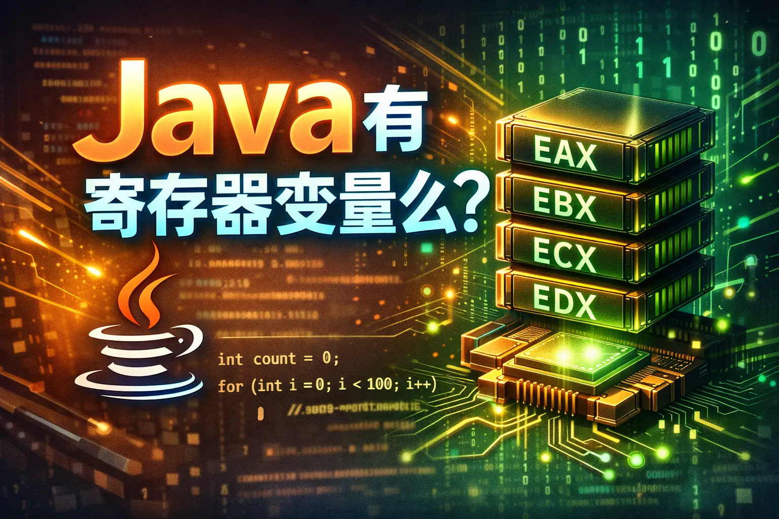 Java 语言层面不存在寄存器变量,开发者无法显式将变量声明为寄存器变量。寄存器属于硬件与 JVM 实现细节,变量是否进入寄存器由 JIT 编译器在运行时自动优化决定。Java 采用栈式字节码结构,通过虚拟机实现跨平台抽象,同时借助寄存器分配、方法内联和逃逸分析等技术提升性能。因此,在实际开发中无需关注寄存器控制,而应专注于高质量代码与整体性能设计。