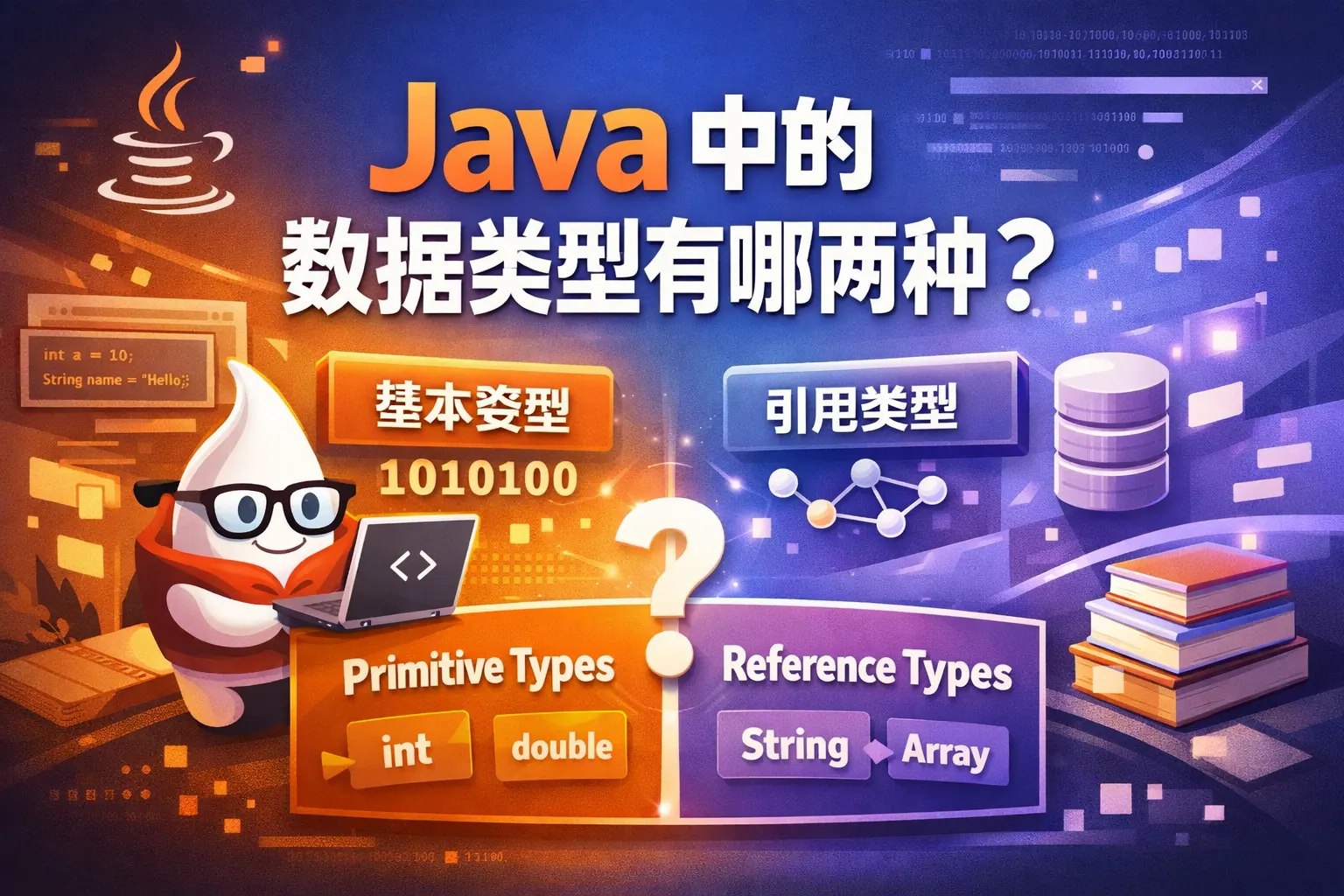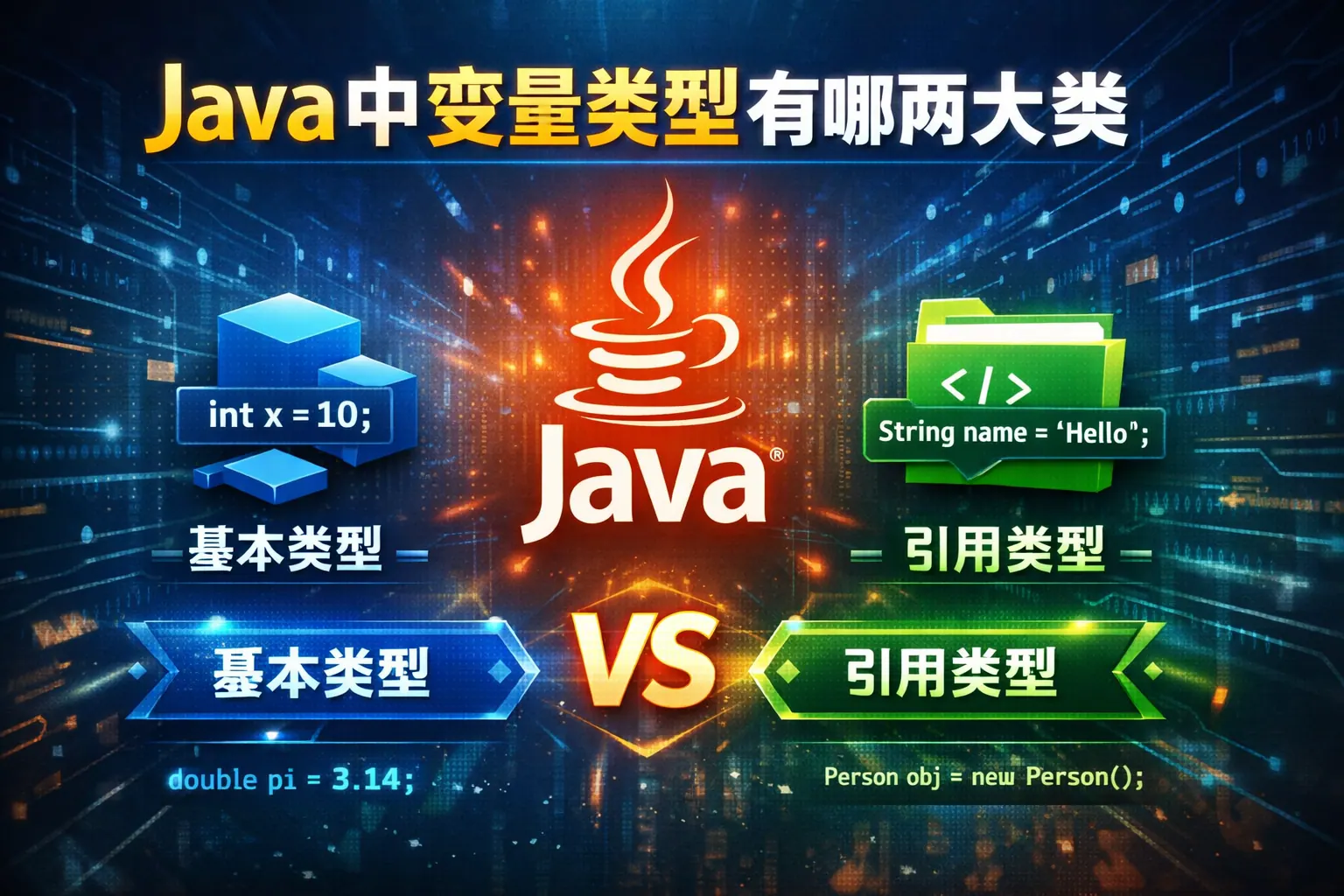 Java 语言中的数据类型主要分为两种:基本数据类型和引用数据类型。基本数据类型用于表示最基础的数据值,具有固定大小和较高执行效率,适合数值计算和简单逻辑处理;引用数据类型用于表示对象和复杂结构,通过引用指向堆内存中的实例,具备更强的抽象和扩展能力。两者在内存分配、赋值方式、参数传递和比较规则上存在本质差异,共同构成了 Java 稳定而高效的类型体系,是理解 Java 编程和 JVM 运行机制的核心基础。