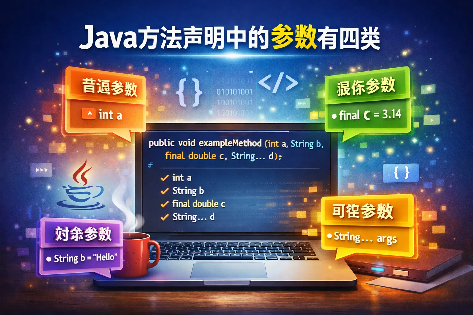 Java 方法声明中的参数从完整调用视角可归纳为四类:形式参数、实际参数、可变参数和隐式参数 this。形式参数定义方法的输入结构,实际参数在调用时提供真实数据,可变参数用于接收不确定数量的输入,而 this 作为隐式参数支撑实例方法的面向对象语义。这种分类覆盖了方法从声明到执行的全过程,有助于理解 Java 只有值传递的本质,并在实际开发中指导方法签名设计、提升代码可读性与系统可维护性。