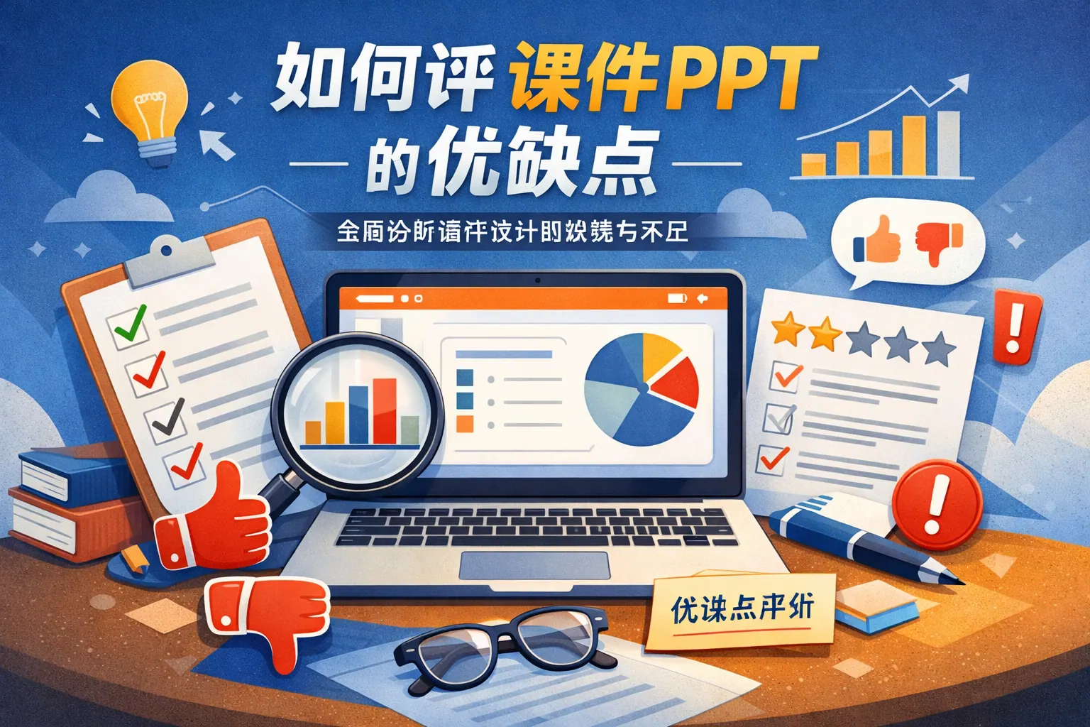 评课件PPT的关键在于从教学目标匹配度、内容结构逻辑、视觉设计可读性、信息密度控制以及课堂互动支持五个方面进行系统分析。优秀课件应服务教学目标、结构清晰、视觉简洁、重点突出并促进学生参与;而常见缺点包括内容堆砌、逻辑混乱、视觉干扰和缺乏互动。通过建立量化评价体系并结合教学反馈持续优化,才能真正提升课件质量与课堂教学效果。未来课件将更强调互动深度与学习效果导向。