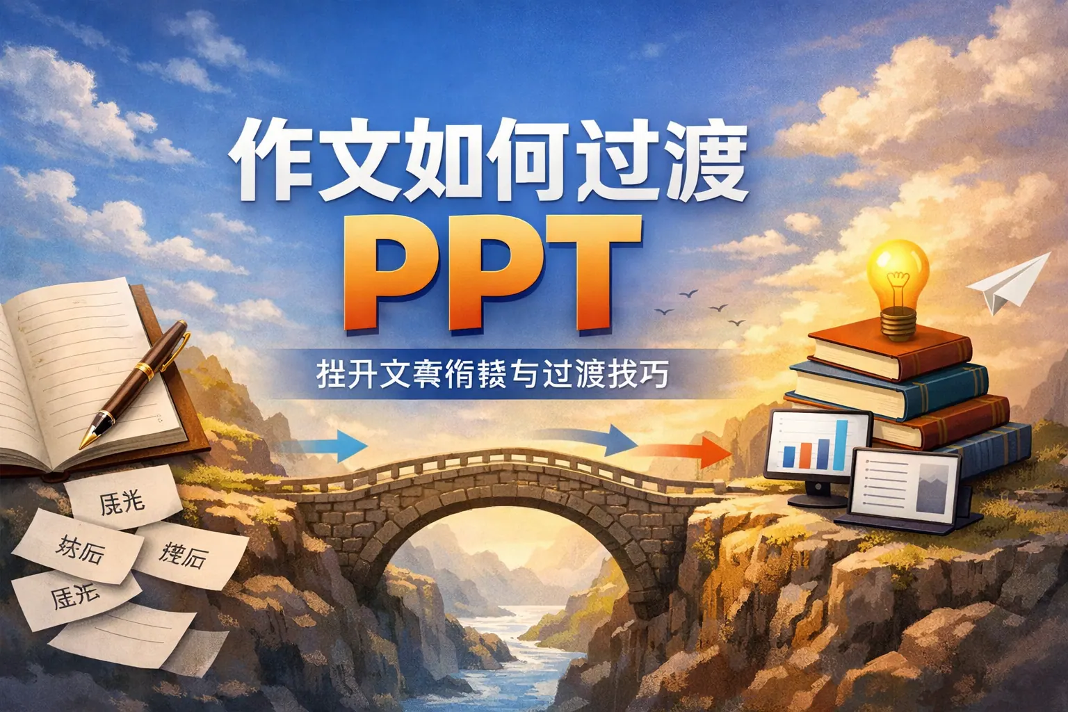设计“作文如何过渡”的PPT,应围绕过渡的逻辑本质展开,通过结构可视化、类型分类、文体对比与课堂练习,把抽象的衔接技巧转化为可操作方法。有效的过渡教学强调思想推进而非连接词堆砌,结合范例拆解与互动训练,能够提升学生文本连贯性与表达逻辑能力,从而全面提高写作质量。
