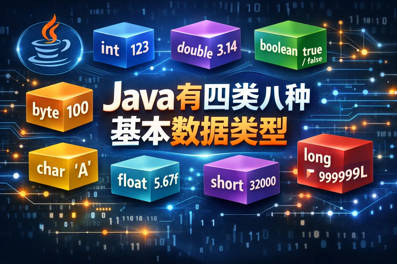Java 的四类八种基本数据类型包括整型、浮点型、字符型和布尔型,共八种:byte、short、int、long、float、double、char、boolean。它们在内存占用、取值范围与精度上各不相同,是 Java 程序设计与性能优化的基础。理解这些类型的默认值、转换规则及应用场景,有助于写出更高效、稳定和安全的代码,是学习 Java 的核心内容。