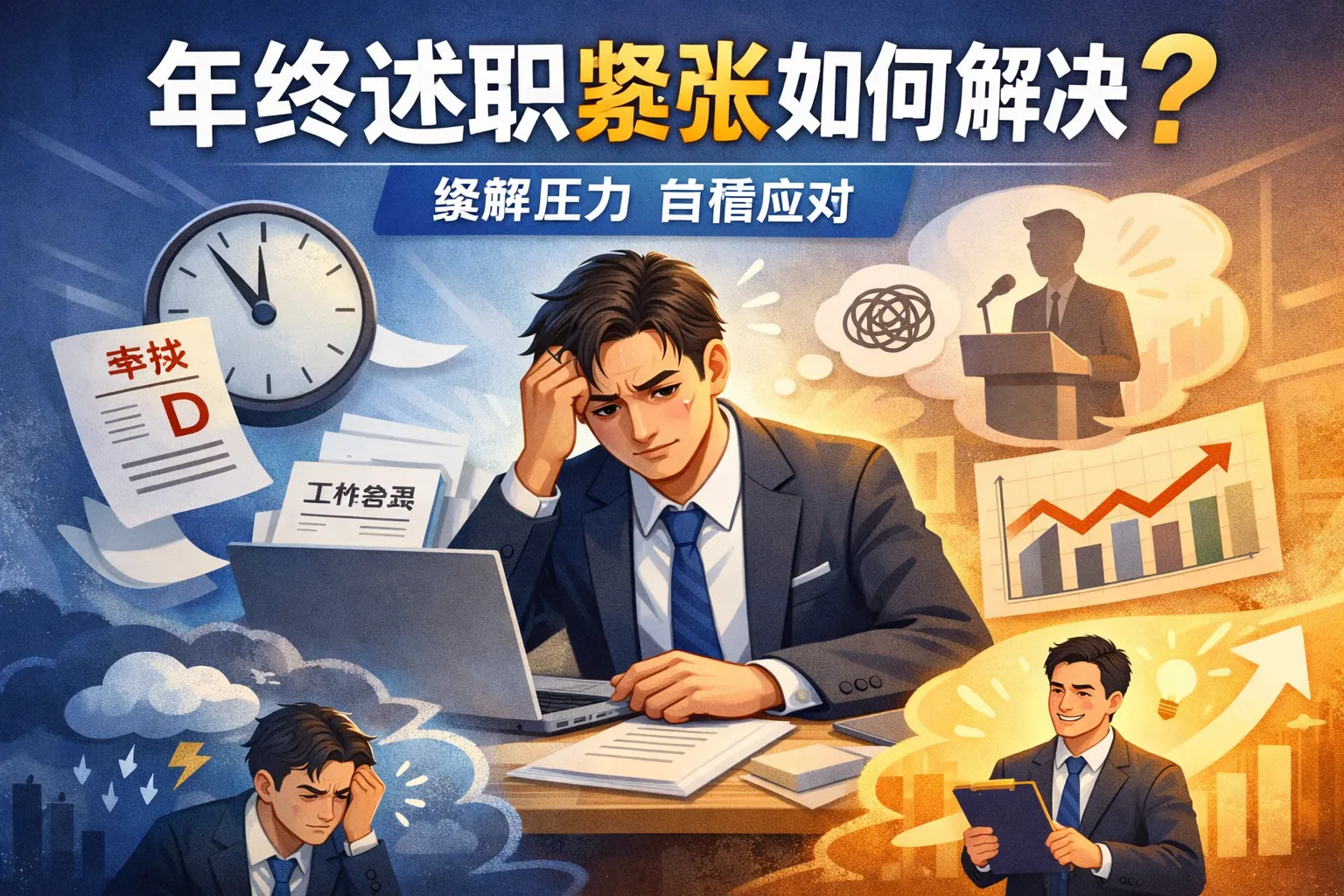 本文围绕年终述职紧张问题,从诱因拆解、预演体系搭建、现场干预、长效强化及复盘闭环五个方面,结合行业报告数据给出系统解决方案,指出提前搭建逻辑框架和场景化预演可有效降低紧张感,同时介绍生理放松和认知重置等即时技巧,以及日常积累和认知调整的长效方案,帮助职场人从容完成年终述职。