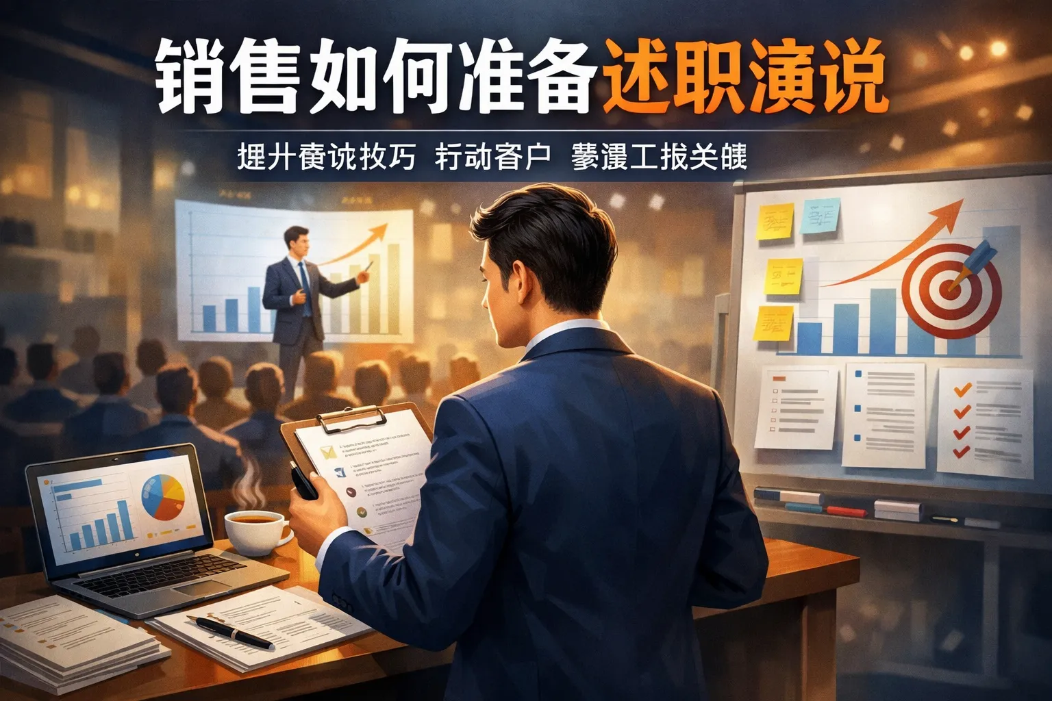 这篇文章围绕销售述职演说准备展开,先介绍了锚定述职核心目标的具体方法,包括区分场景诉求、对齐评委优先级和设定可量化目标;接着讲解了搭建逻辑闭环内容框架的步骤,通过STAR模型重构业绩叙事、补全成长链路和规划落地路径;然后说明了用数据强化说服力的方式,搭建三维数据体系、设计对比表格和场景化解读数据;还提到适配场景的呈现优化、规避述职常见坑点和临场预演调试的技巧,帮助销售提升述职通过率和说服力。