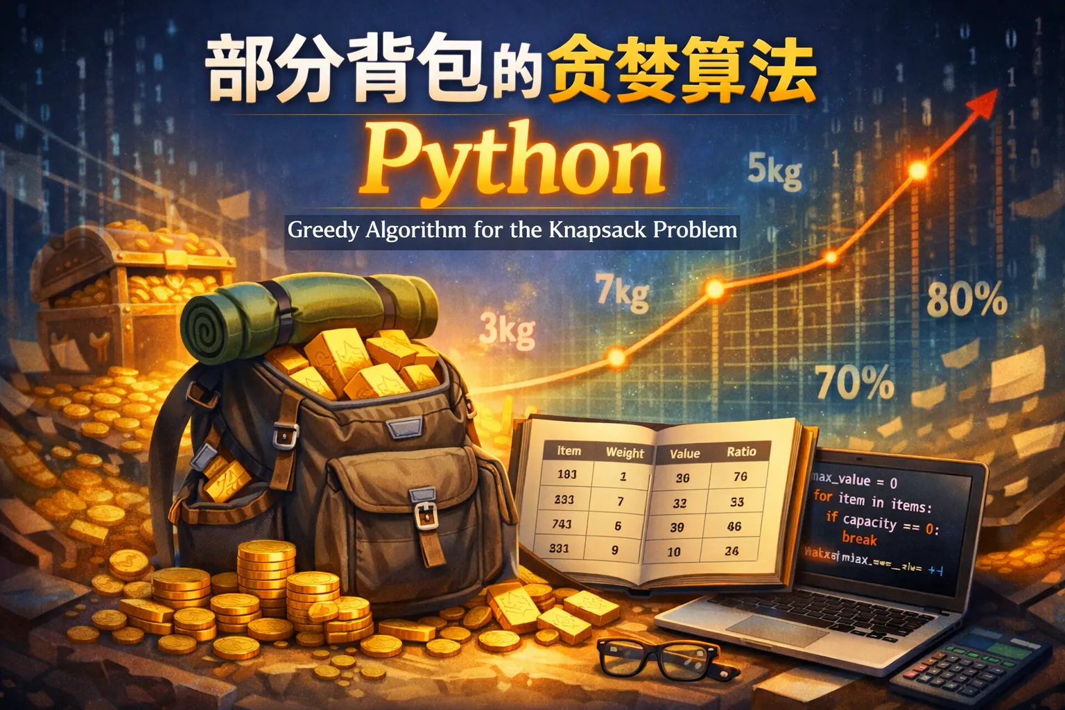 本文系统讲解了部分背包问题的贪婪算法原理与 Python 实现。核心结论是,在允许物品拆分的前提下,只要按照单位价值从高到低进行选择,就能在多项式时间内获得全局最优解。文章从问题定义、算法建模、代码实现、示例演算到与 0/1 背包的对比,完整说明了该算法为何成立以及如何在实践中正确使用,并结合权威教材与公开资料,阐述了其理论基础与工程价值。