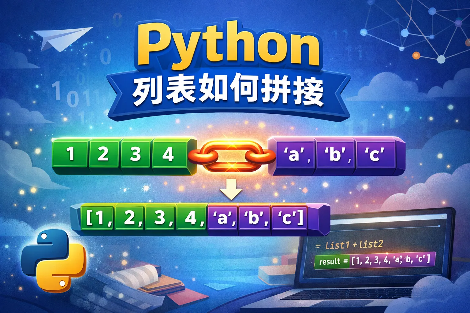 可以使用加号操作符(+)将两个列表合并成一个新列表,比如 list3 = list1 + list2。另外,使用 list1.extend(list2) 方法可以将列表 list2 的元素添加到 list1 中。这两种方法都能实现列表的拼接。