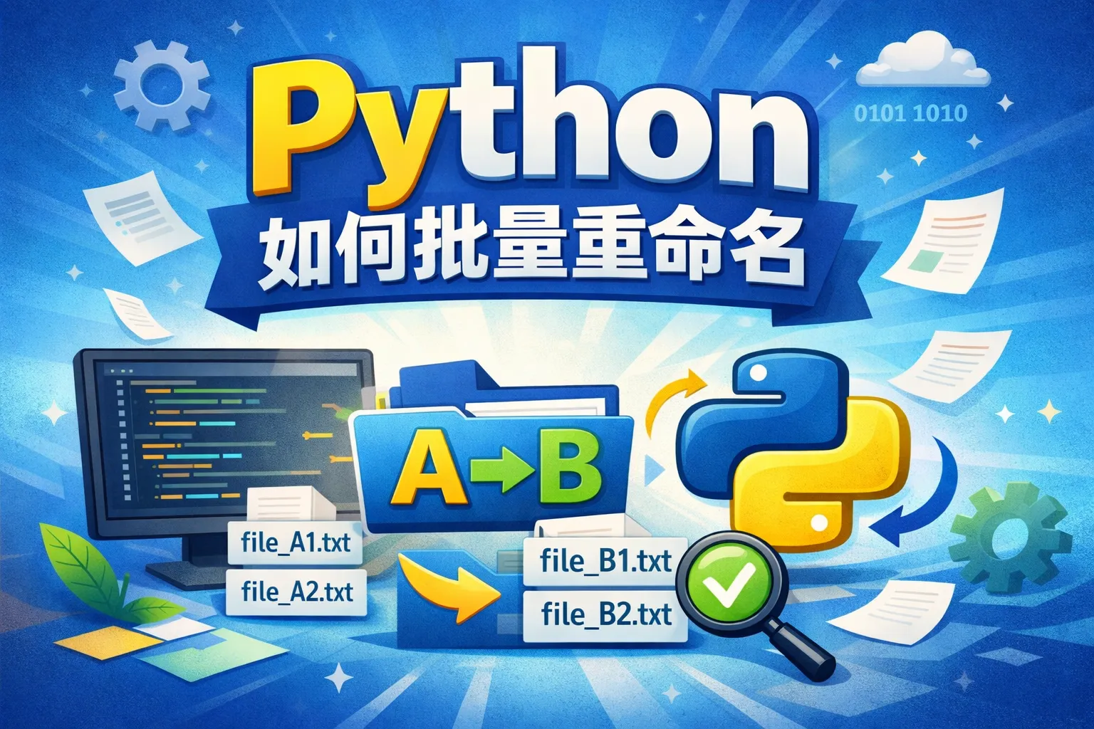 可以使用Python的os模块,通过os.rename()函数配合循环来实现批量重命名。读取文件夹中的所有文件名,依照需求生成新的文件名,然后用os.rename(old_name, new_name)完成重命名。