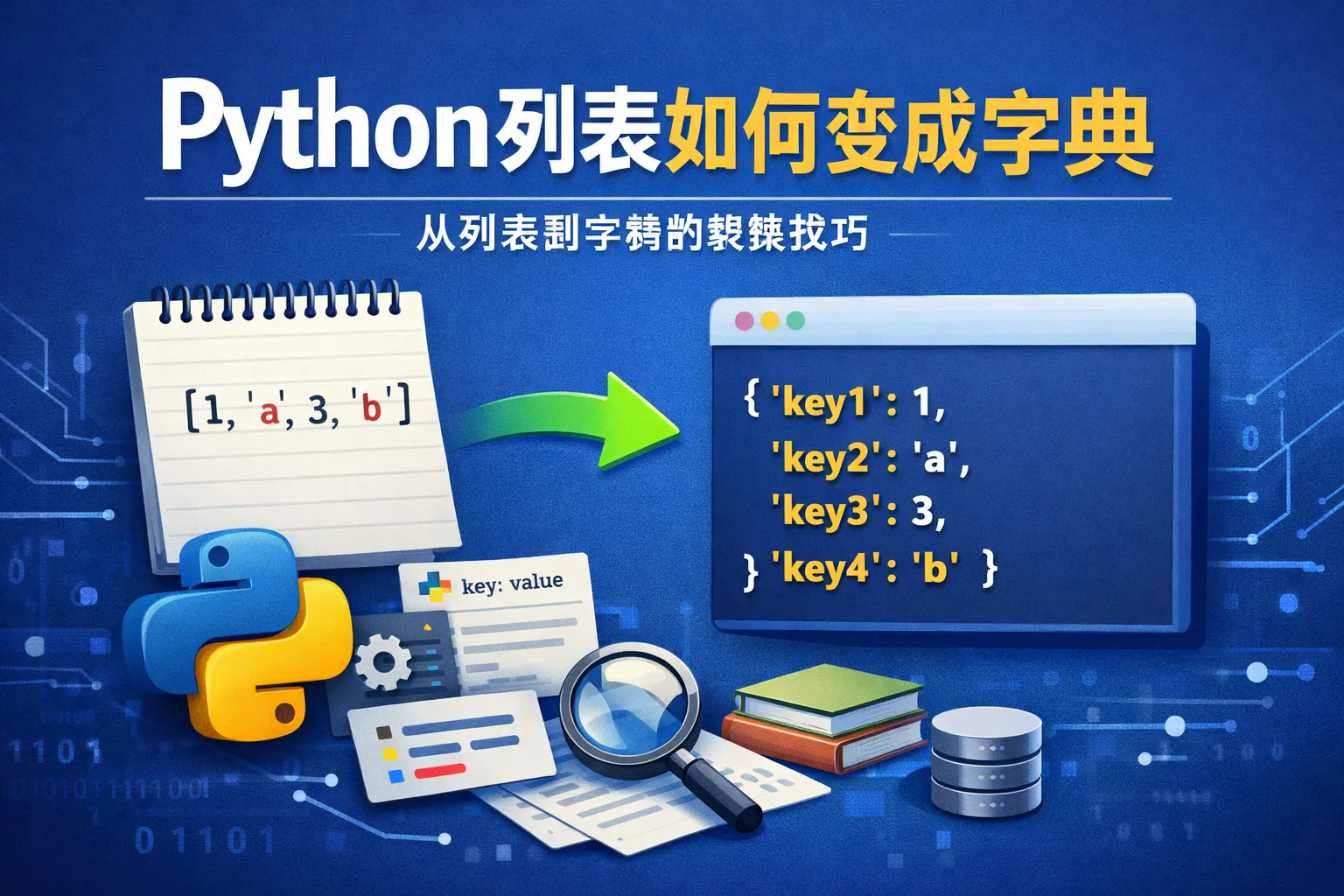 可以使用Python内置的zip函数将两个列表对应元素配对,再利用dict()函数将配对结果转换成字典。例如,假设key_list是键列表,value_list是值列表,可以写成dict(zip(key_list, value_list)),这样就能生成一个以key_list元素为键,以value_list元素为值的字典。