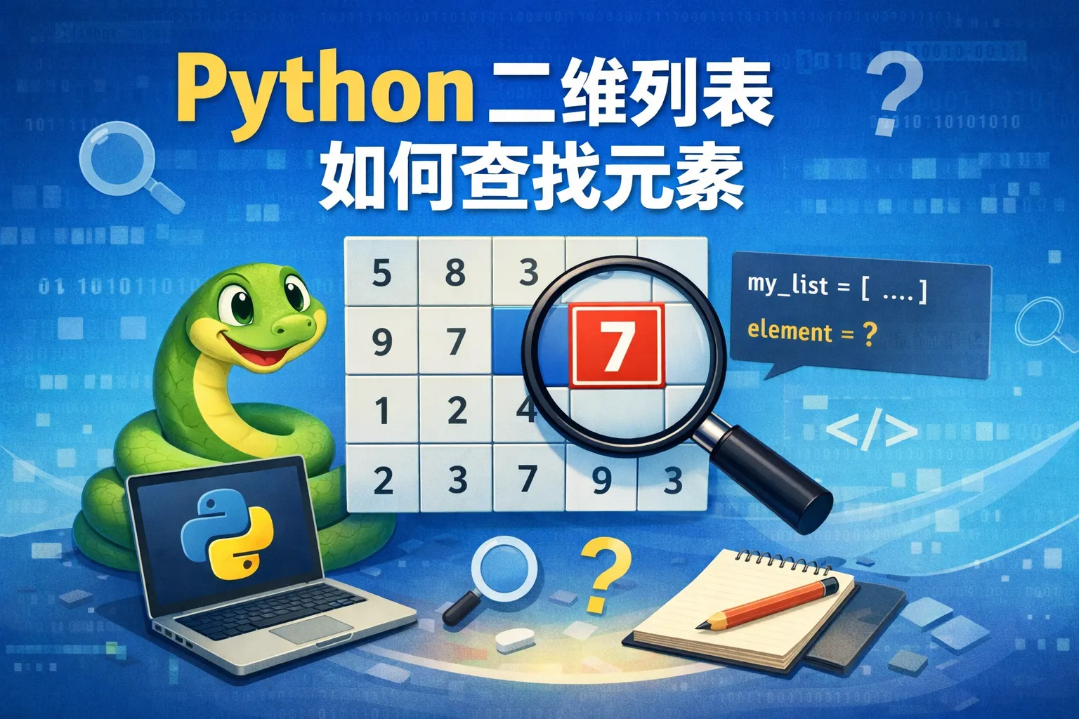 通过enumerate遍历每行和每个元素的索引,配合列表推导可以快速筛选出所有匹配元素的位置。这样不仅代码简洁,也方便批量获取元素的多重坐标。