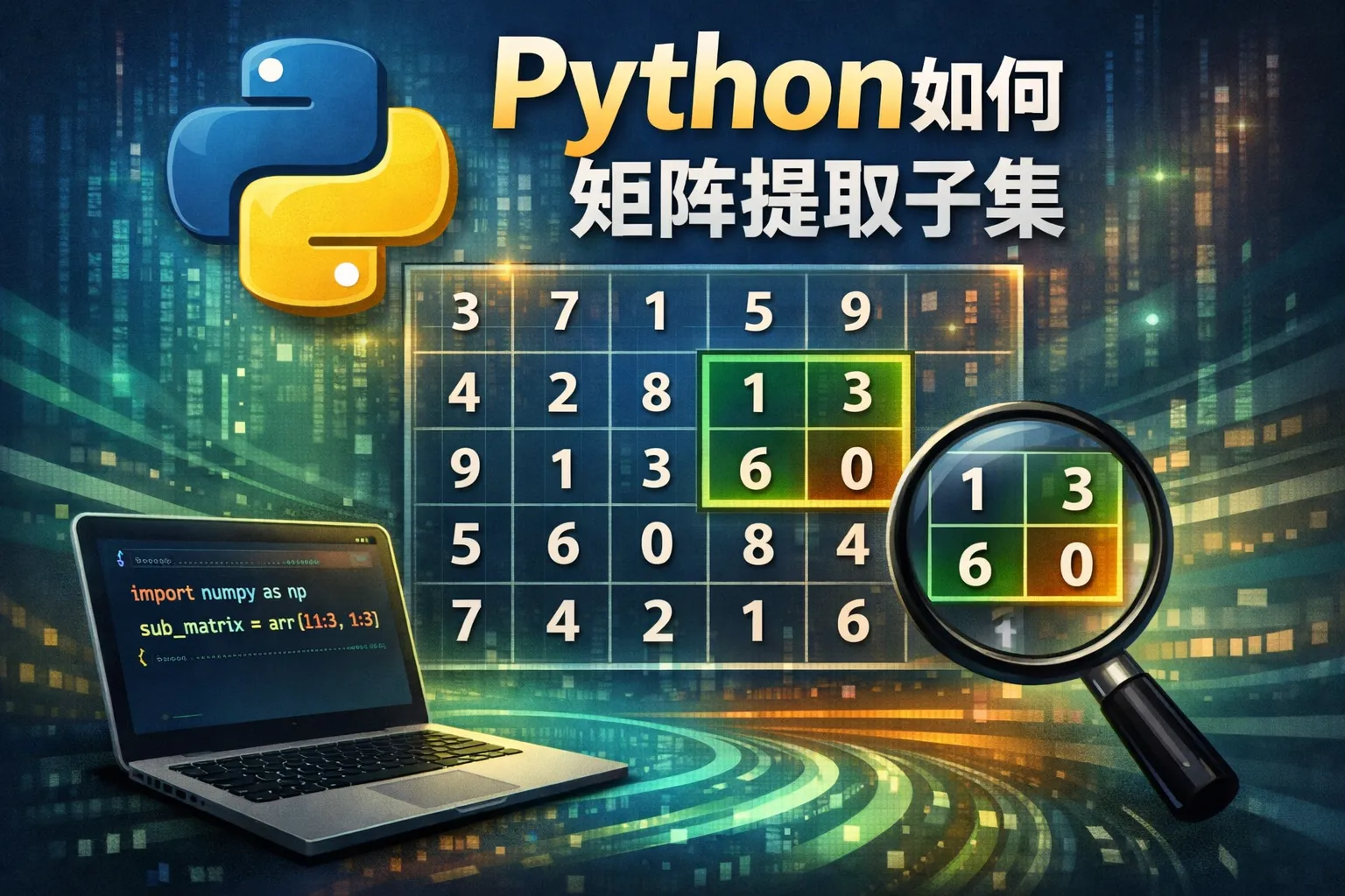 在Python中,可以利用NumPy库对矩阵进行操作。通过切片语法(matrix[row_indices, column_indices]),可以轻松获取特定的行与列。例如,matrix[1:3, 2:5]会提取第2到第3行和第3到第5列组成的子矩阵。