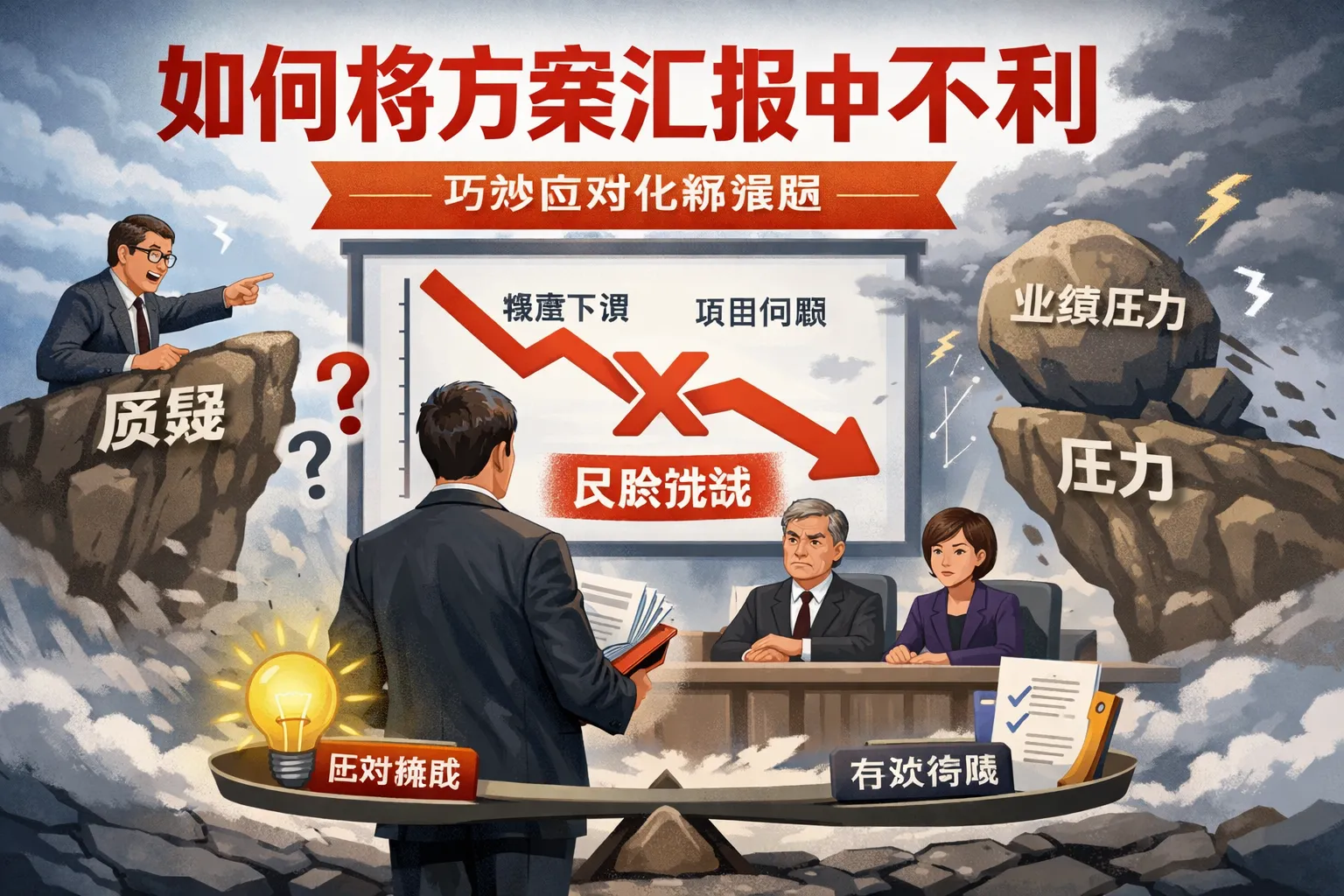 提前分析潜在的不利点,做充分的数据支持和背景说明,围绕问题设计切实可行的应对措施。练习汇报时模拟可能的提问,准备清晰、合理的回应。对不利信息有清晰的认识并主动控制叙述节奏,可以减少负面反应。