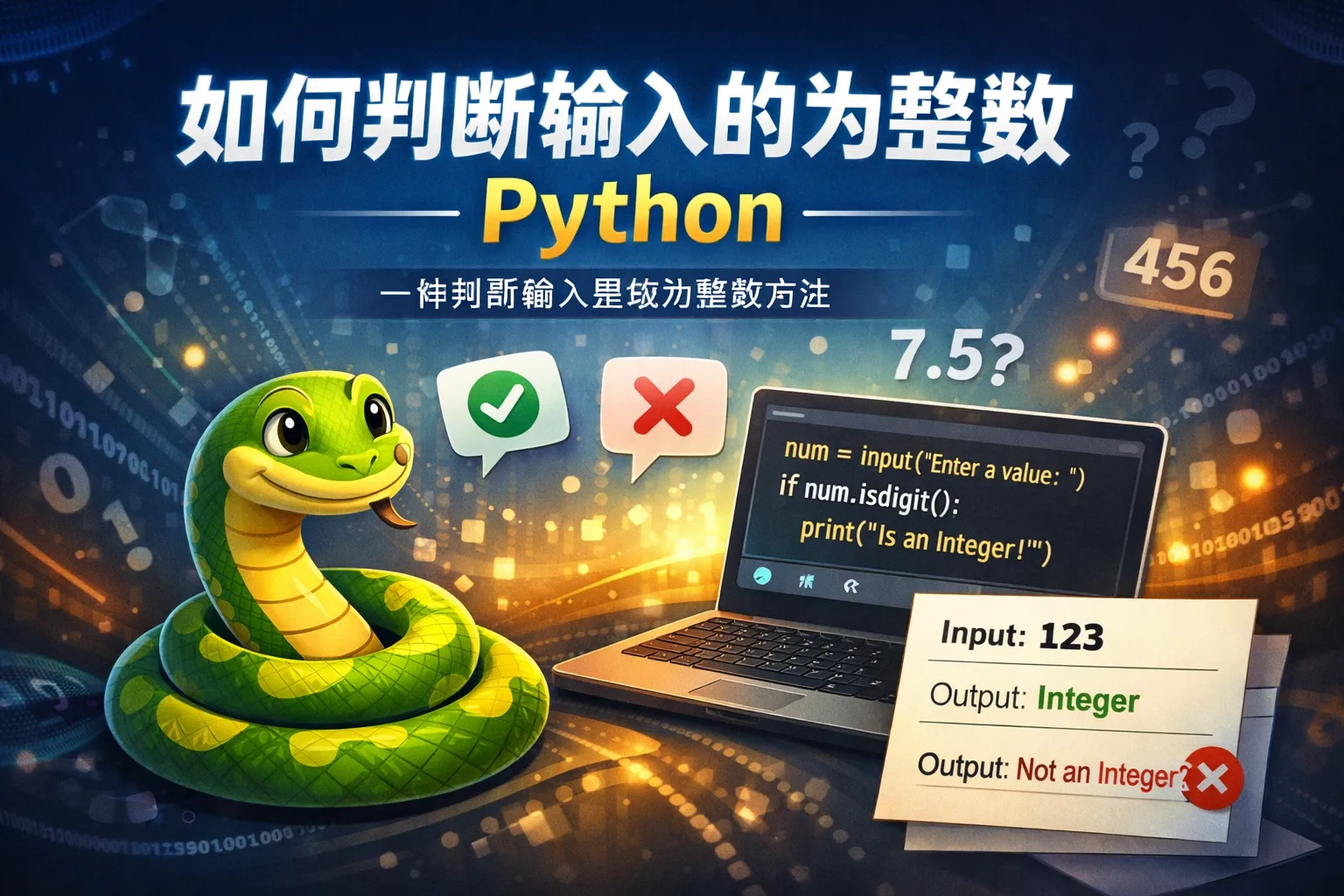 可以使用try-except结构尝试将字符串转换为int,若无异常说明是整数。另外,可以使用字符串的 isdigit() 方法判断是否全部由数字组成,但要注意负号和空白字符的情况。