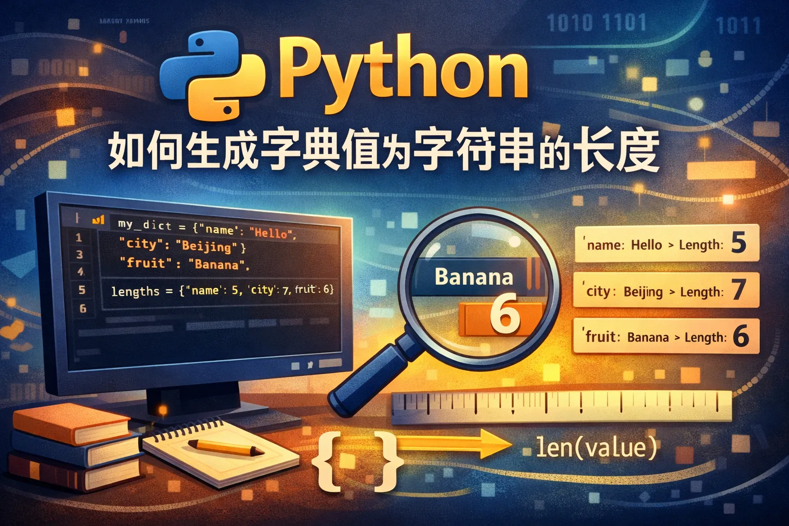 可以通过字典推导式遍历字典的键值对,利用内置len()函数计算每个字符串值的长度。例如,给定字典dict_example,可以写成:{key: len(value) for key, value in dict_example.items()},这样就生成了一个新字典,键不变,值变成对应字符串的长度。