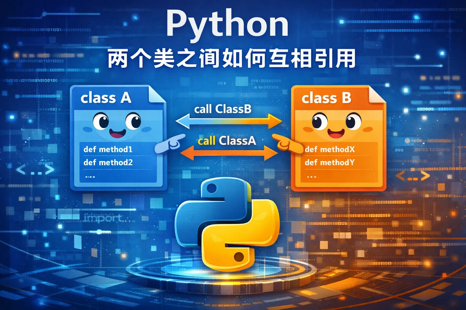 直接互相导入会导致循环导入错误。解决方法包括将两个类放在同一个模块中、使用延迟导入(即在函数内部导入对方模块),或者在类型提示中使用字符串形式的类型名,避免运行时导入冲突。