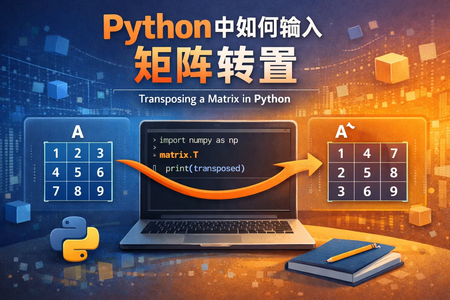 使用NumPy库,只需调用numpy数组的.T属性即可得到矩阵的转置。例如,若矩阵为a,则a.T即是它的转置。纯Python中也可以通过列表推导式来实现转置,但效率和代码简洁度不及NumPy。