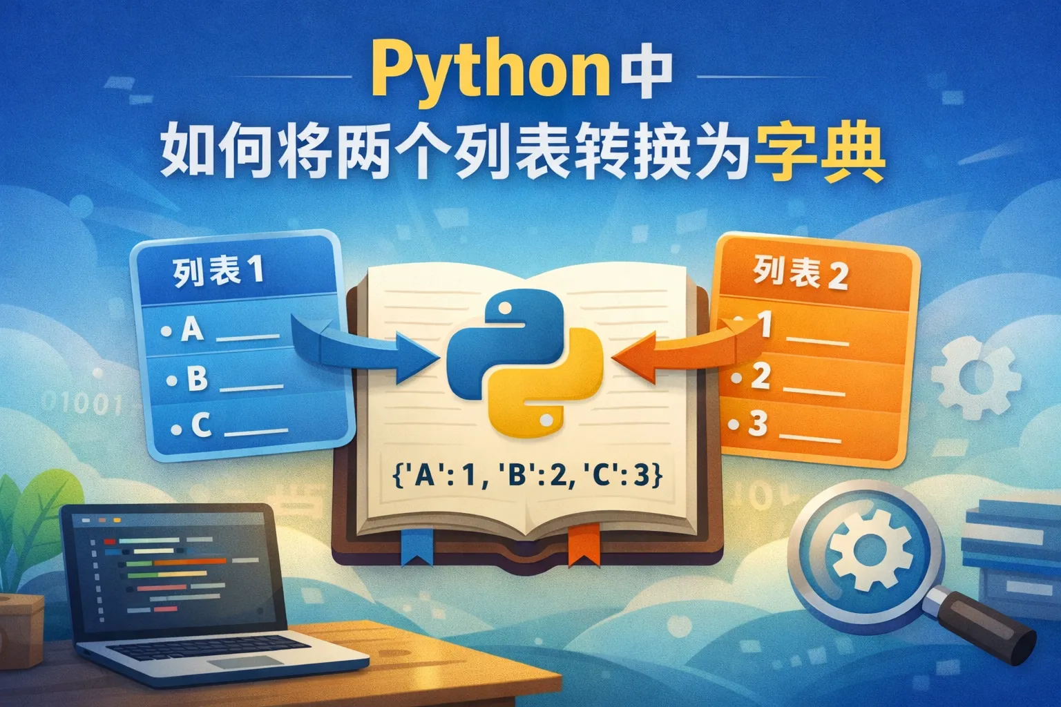 可以使用Python内置的zip函数将两个列表打包后,直接用dict构造函数转换成字典。例如:keys = ['a', 'b', 'c'],values = [1, 2, 3],使用dict(zip(keys, values))即可得到 {'a': 1, 'b': 2, 'c': 3}。