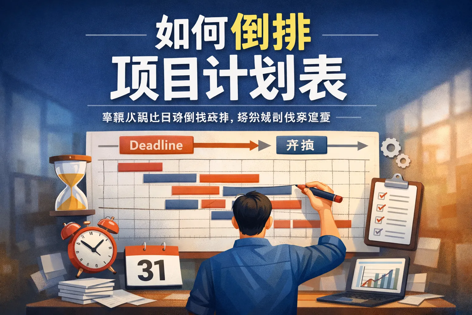 倒排项目计划表通常从项目的完成日期向前推算各个任务的开始和结束时间。关键步骤包括明确项目的最终截止日期,分解主要任务,确定每个任务的持续时间,然后根据任务之间的依赖关系逆向安排任务顺序。通过这样的方法,可以合理分配资源并识别关键路径,确保项目顺利推进。