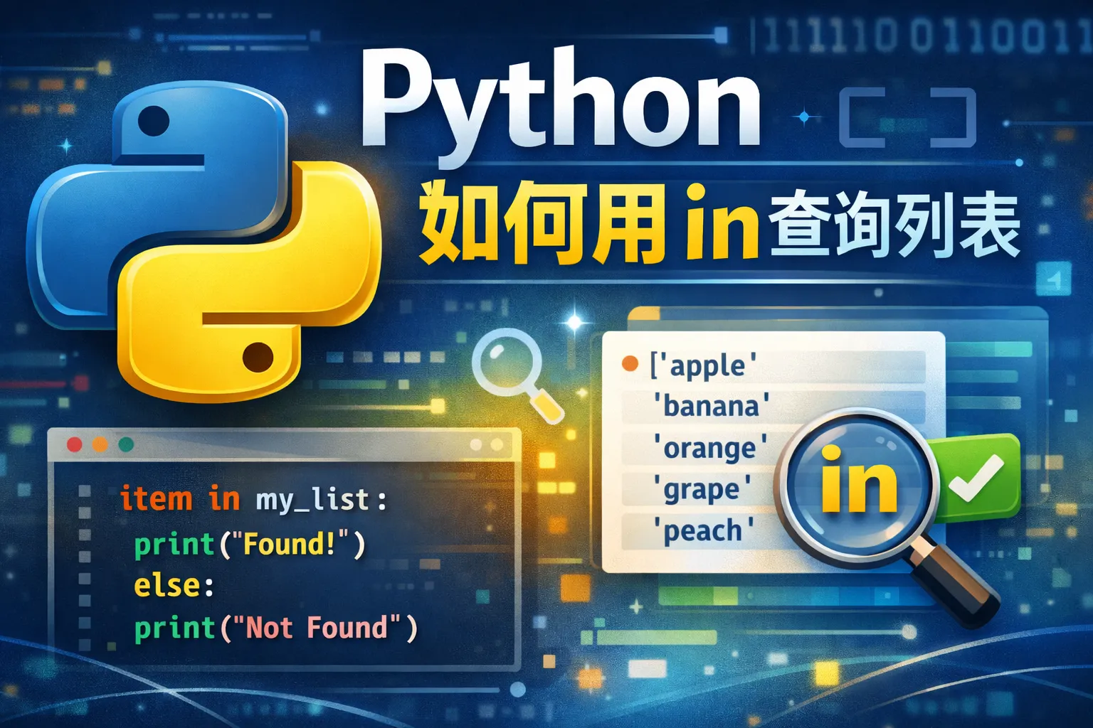 'in'关键字用于判断元素存在列表内,它会对列表的每个元素进行比对,直到找到匹配项或者遍历结束。需要注意的是,查找是基于元素的值比较,如果列表中元素是复杂类型(如列表、字典),比较时会基于它们的内容而非引用地址。此外,'in'操作符的效率与列表长度成正比,列表越长,查询速度越慢。