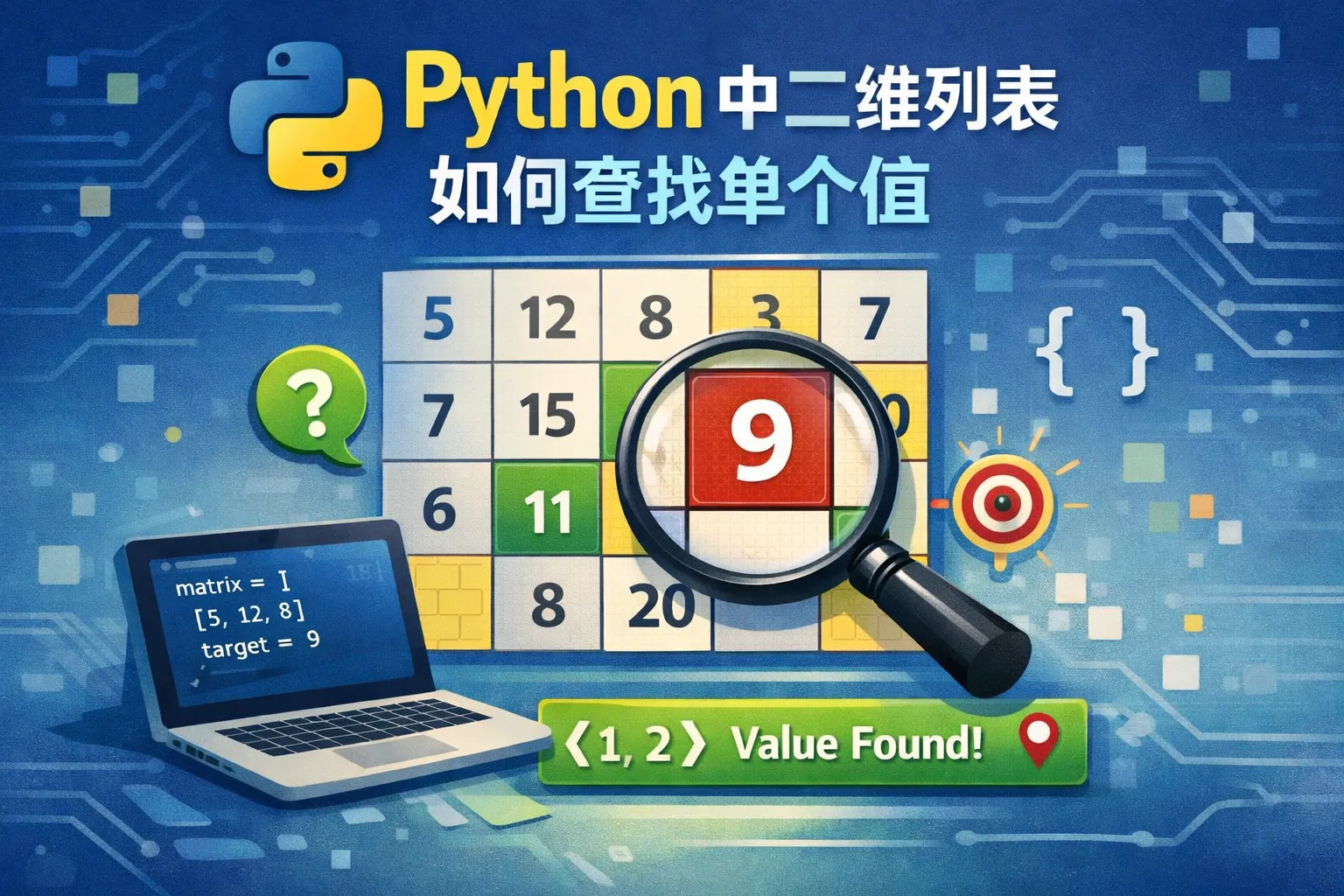 使用双层循环遍历每个元素,遇到与目标值相等的元素时,将其行和列索引加入列表,全部遍历完成后即可获得所有出现位置。代码示例: