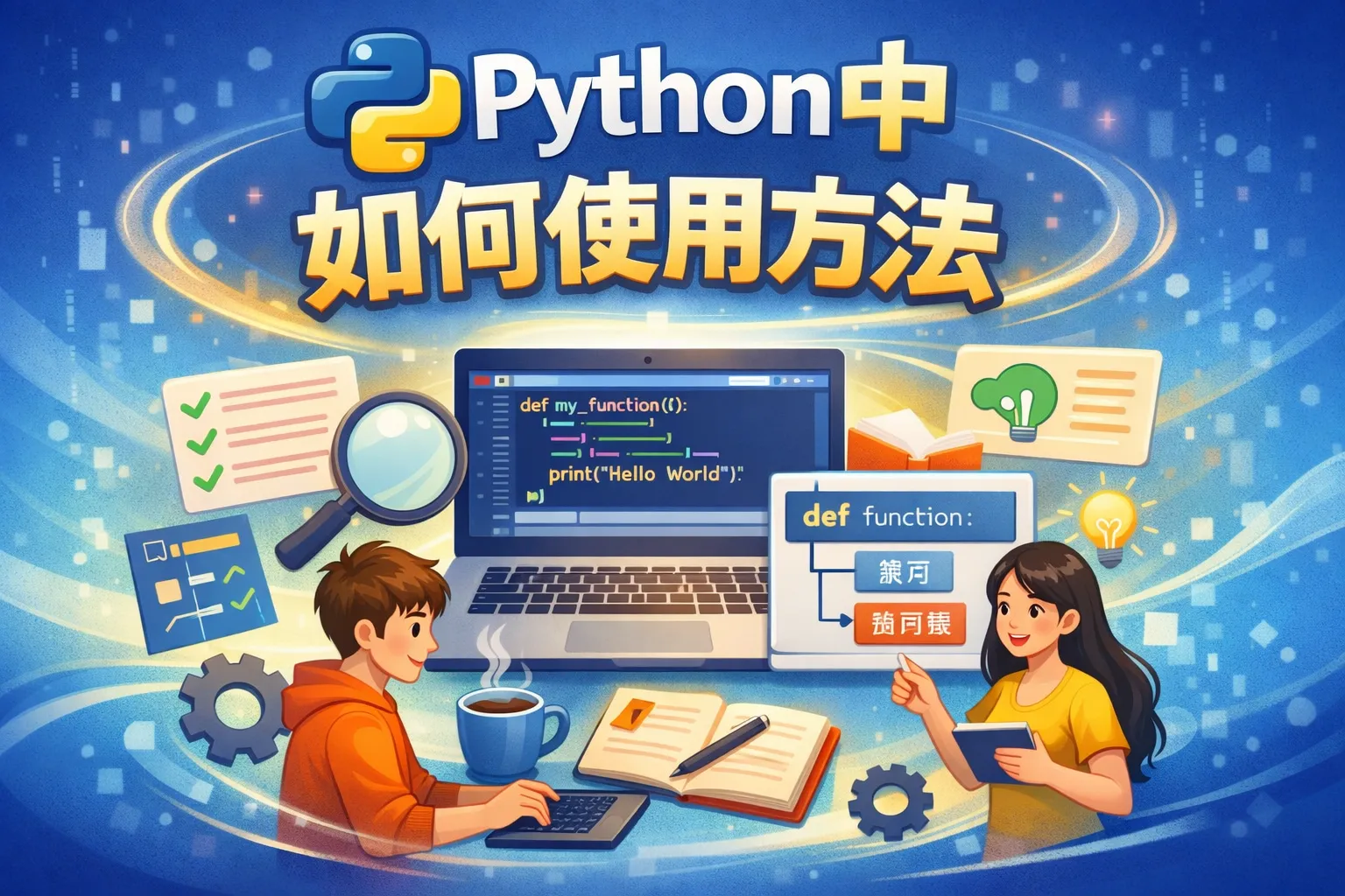 在Python中,方法通常指类中的函数。定义方法需要在类内部使用def关键词,后接方法名和参数列表,再加上方法体。例如:
