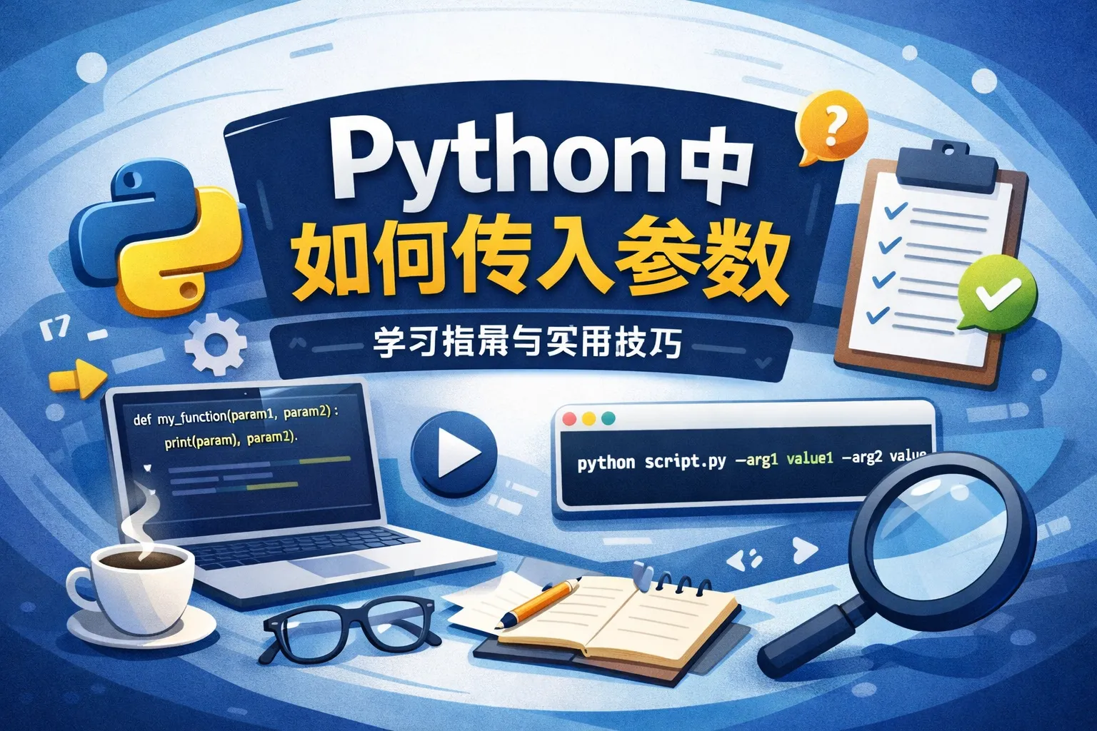 Python函数参数主要有位置参数、关键字参数、默认参数和可变参数。位置参数需要按顺序传入,关键字参数以key=value形式传递,默认参数在函数定义时赋默认值,可变参数可以接受任意数量的位置或关键字参数。