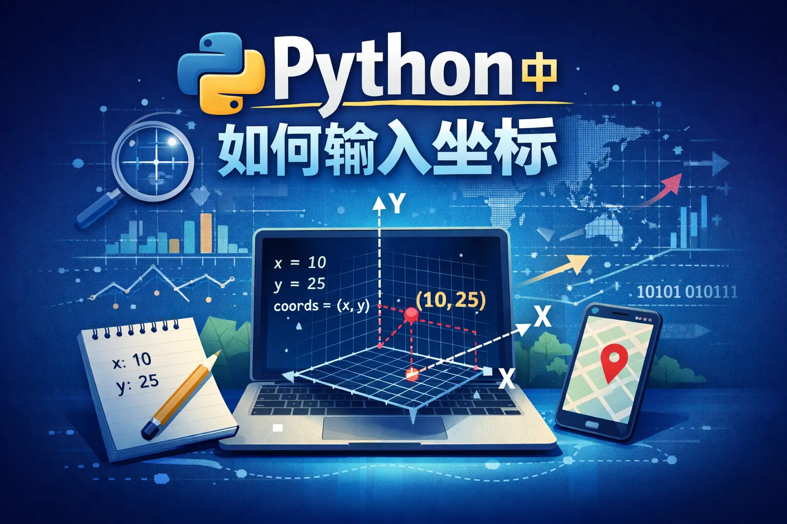 可以使用input()函数让用户输入坐标数据,输入格式通常是用逗号或空格分隔两个数字,比如输入 10,20 或 10 20。然后利用split()方法分割字符串,转换成数字类型。例如:coords = input('请输入坐标(x,y):').split(',');x, y = float(coords[0]), float(coords[1])。