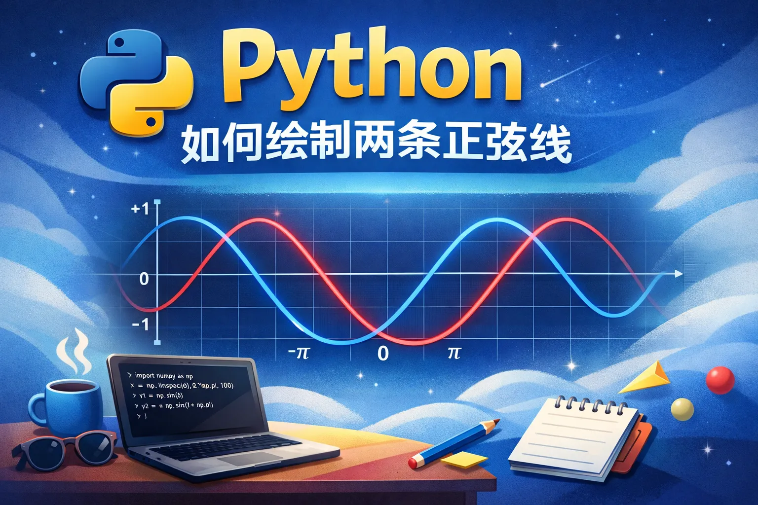 可以利用Python的Matplotlib库。首先,导入numpy生成数据点,然后分别计算两条正弦曲线的y值,最后调用plt.plot画出两条曲线并用plt.show()展示。