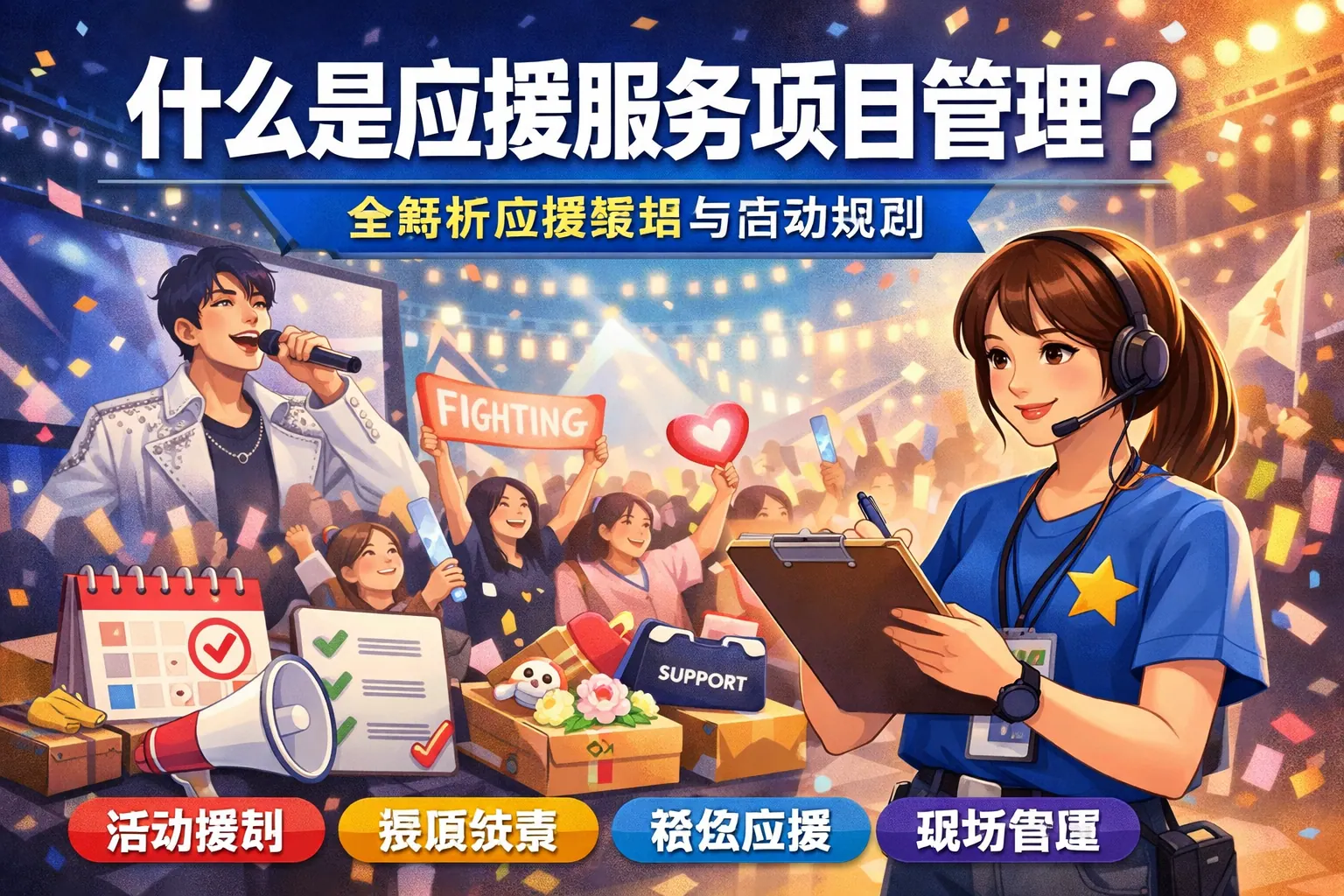 应援服务项目管理主要包含需求分析、项目计划制定、资源配置、团队协作、进度监控以及风险管理等内容。这些环节共同确保应援活动能够顺利进行,达到预期效果。