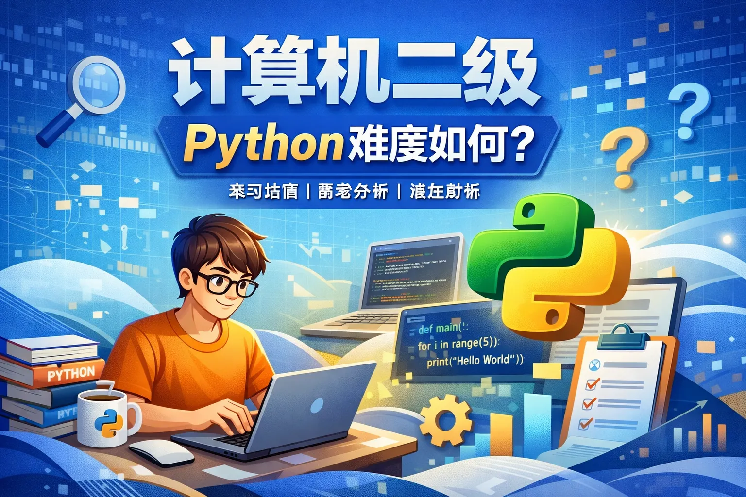 计算机二级Python考试主要考察Python的基础知识和基本编程能力,内容涵盖语法、数据类型、控制结构和简单算法。对于有一定编程逻辑理解的人来说难度适中,但如果完全没有编程背景,可能需要一定时间学习和练习才能顺利通过。建议考生提前进行针对性的复习和练习以打好基础。