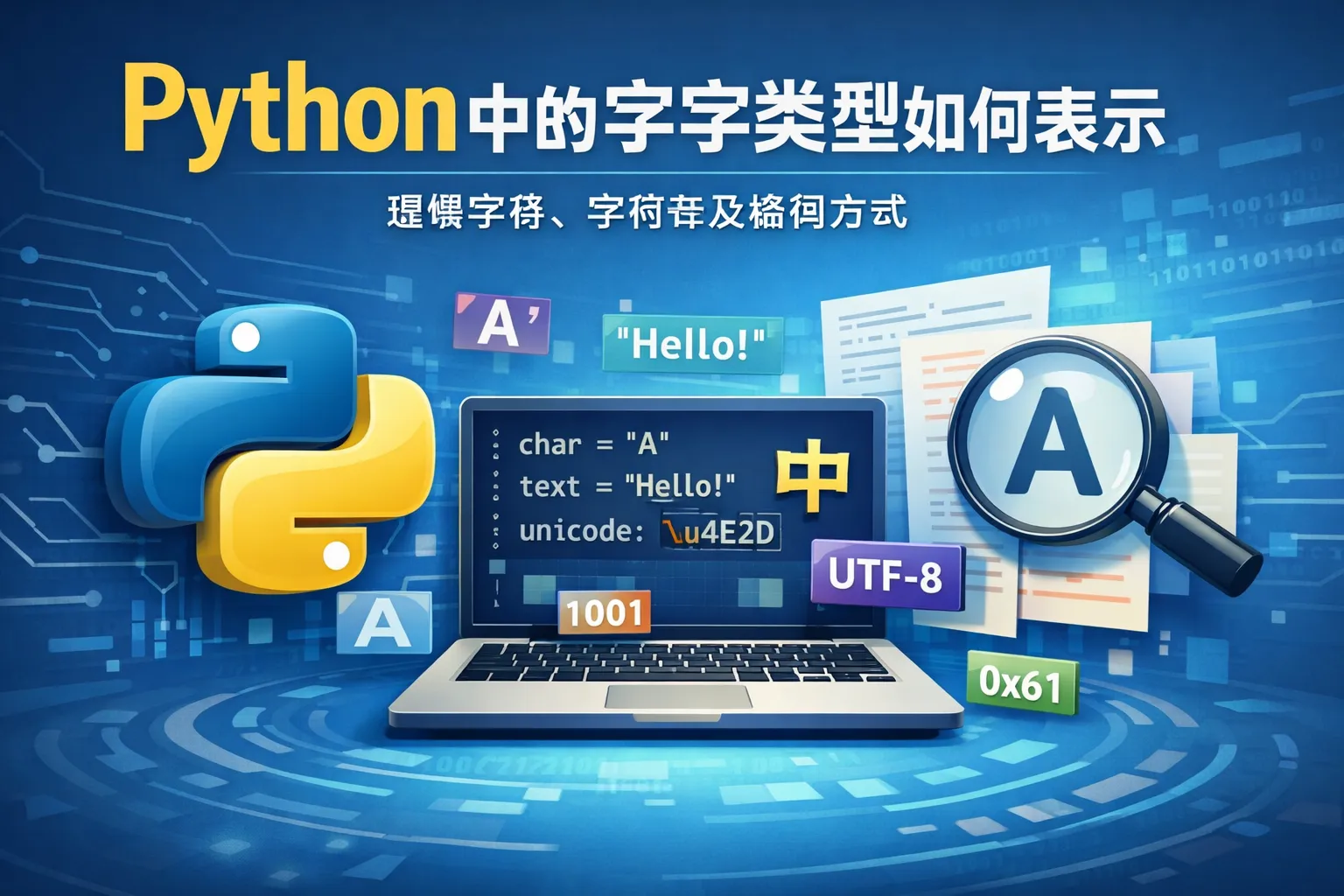 在Python中,字符类型一般表示为字符串(str)。单个字符可以用单引号('a')或双引号("a")括起来。此外,Python没有专门的char类型,单个字符就是长度为1的字符串。