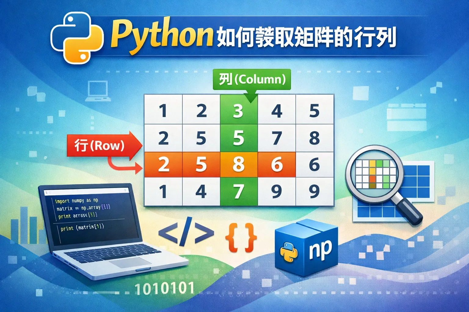 在Python中,如果你用的是NumPy库,可以通过矩阵的shape属性获取行列数。形状是一个元组,形如(行数,列数)。示例: