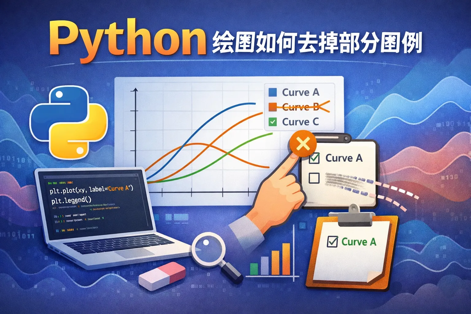 可以在绘图时通过设置label参数,给需要显示图例的曲线赋予标签,对于不想显示的曲线,标签可以设置为下划线开头的字符串(如'nolegend'),这样matplotlib绘制图例时会忽略它们,从而达到隐藏部分图例的效果。