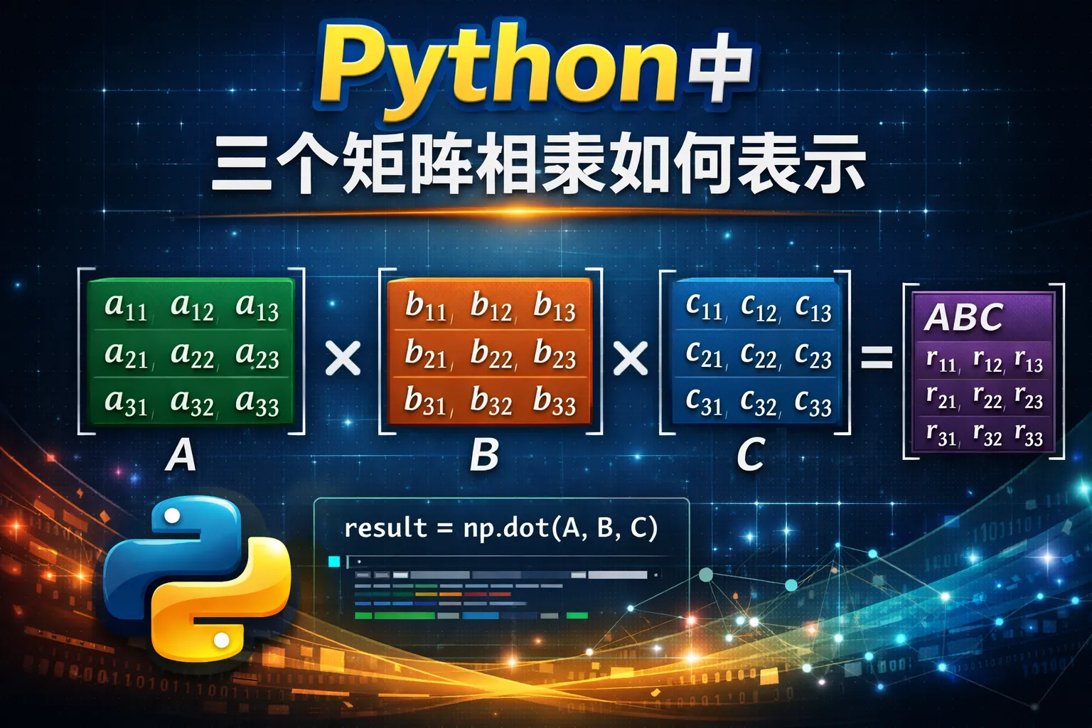 可以导入NumPy库,使用numpy.dot()或@运算符来实现矩阵乘法。假设矩阵A、B、C是NumPy数组,计算三个矩阵的乘积可以写作 numpy.dot(numpy.dot(A, B), C) 或者 A @ B @ C,这样能简洁地得到最终结果。