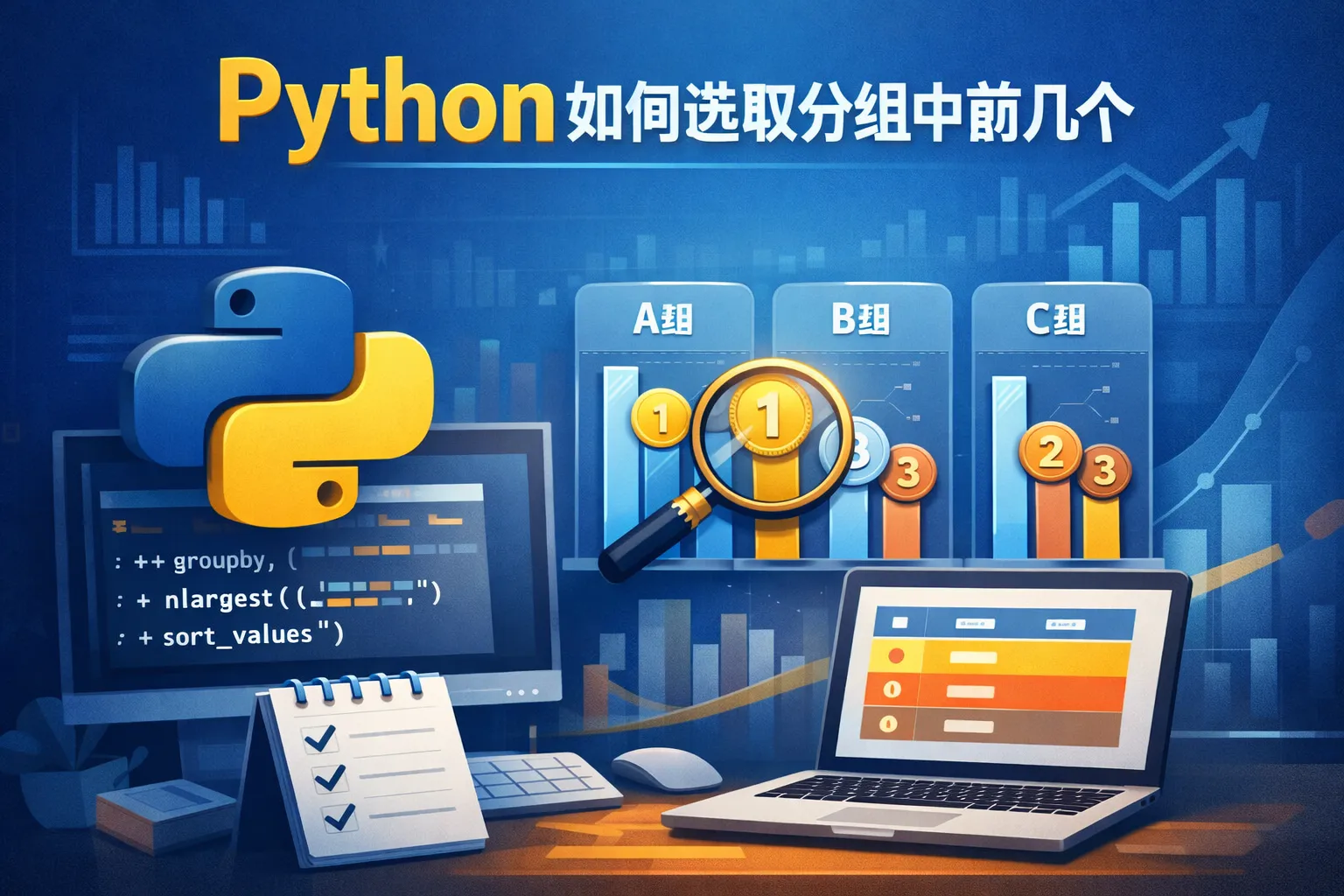 先使用DataFrame的sort_values方法对数据按照排序字段进行排序,接着利用groupby来分组,最后用head函数选取每个组的前几条。如df.sort_values('排序字段').groupby('分组字段').head(3)实现该需求。