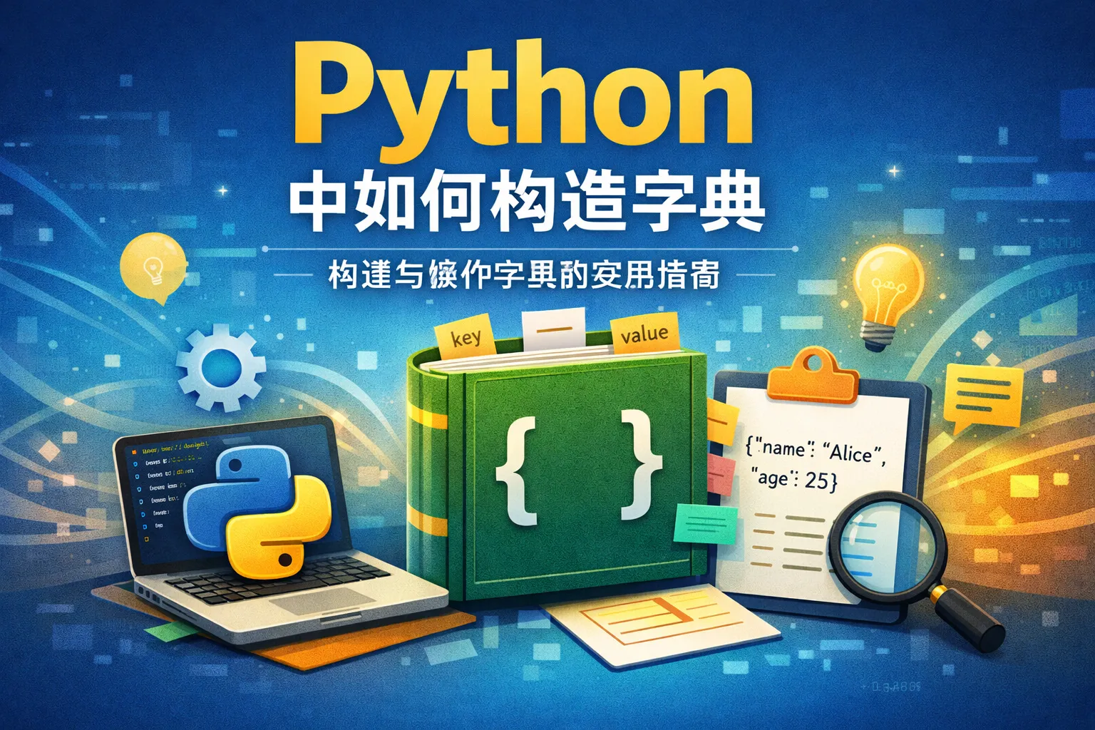 Python中构造字典的方法多样,可以使用大括号语法,例如{'key': 'value'},也可以使用dict()函数,通过传入关键字参数或元组列表来创建字典。此外,还可以通过字典推导式快速生成字典。