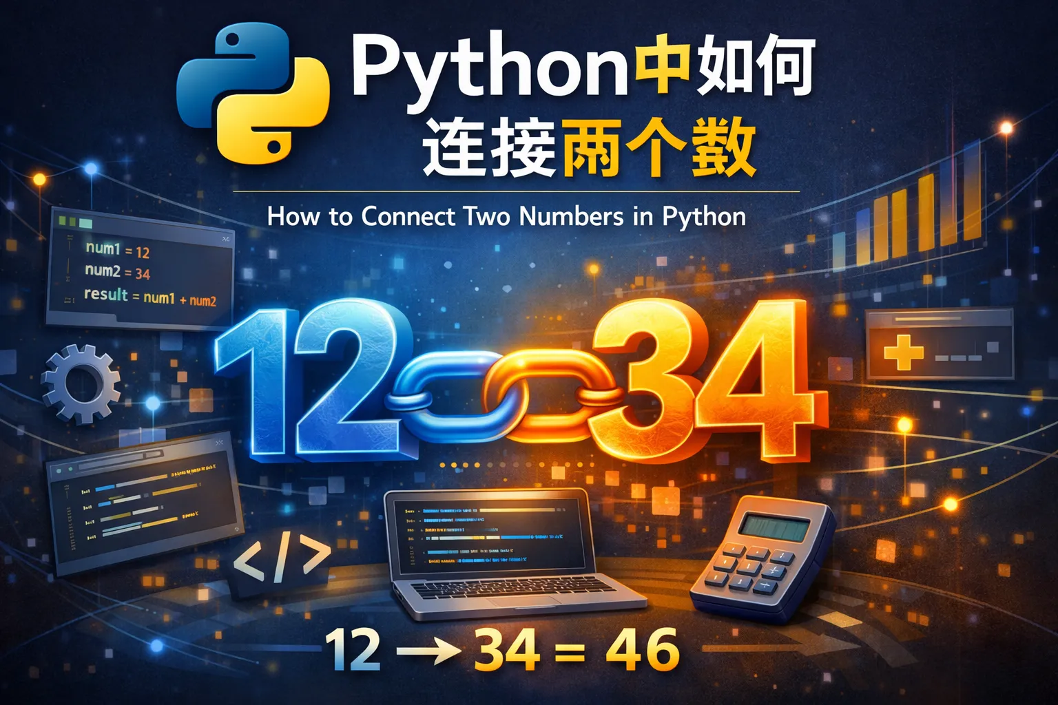 可以通过数学方法实现连接,例如:计算第二个数的位数,再使用乘法运算连接。代码示例:num1 = 12; num2 = 34; result = num1 * (10 ** len(str(num2))) + num2,结果为1234。