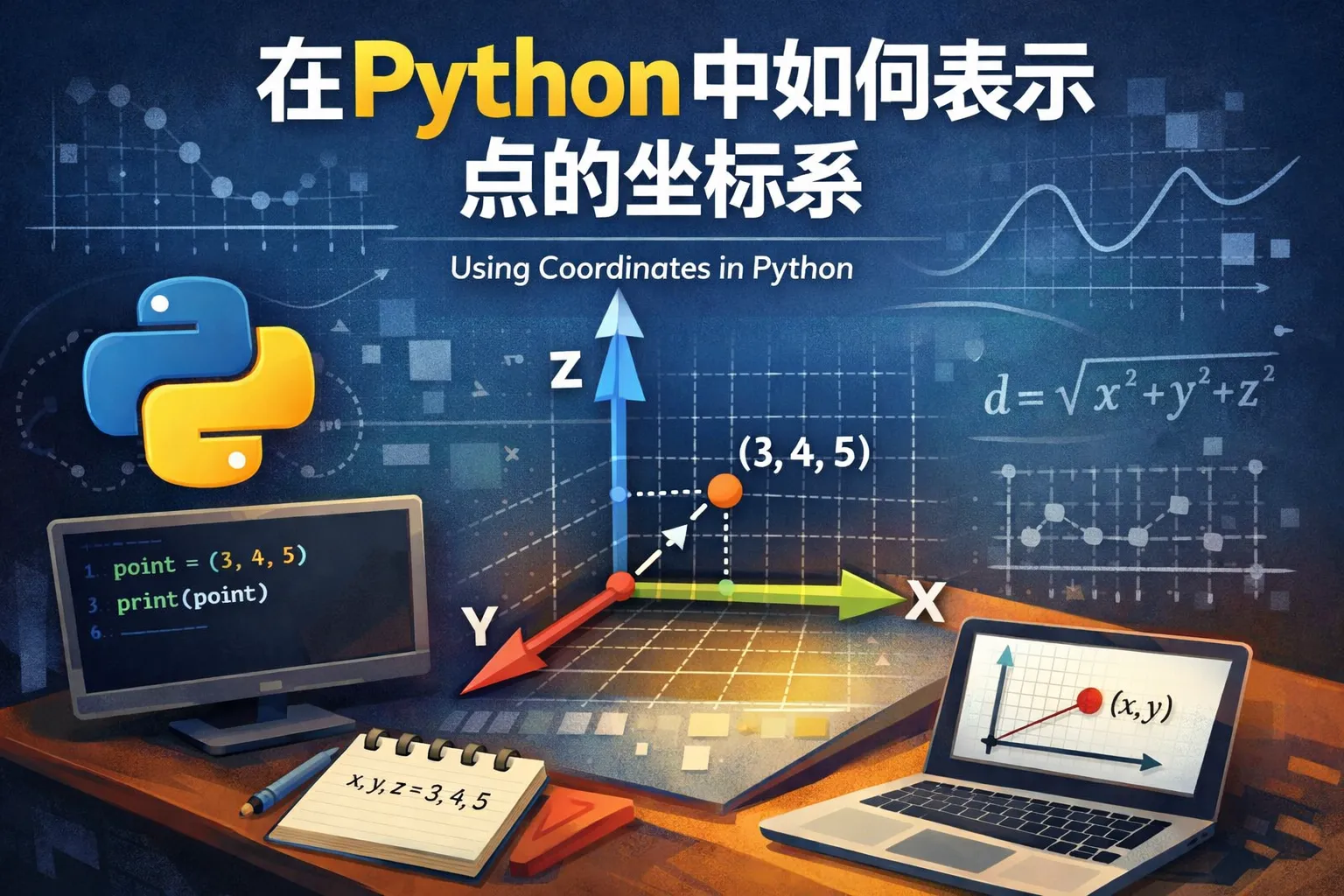 三维点坐标可用三元组 (x, y, z) 或包含三个元素的列表表示。创建自定义类来保存x、y、z属性,同时添加计算距离或向量操作方法,利于处理三维空间问题。